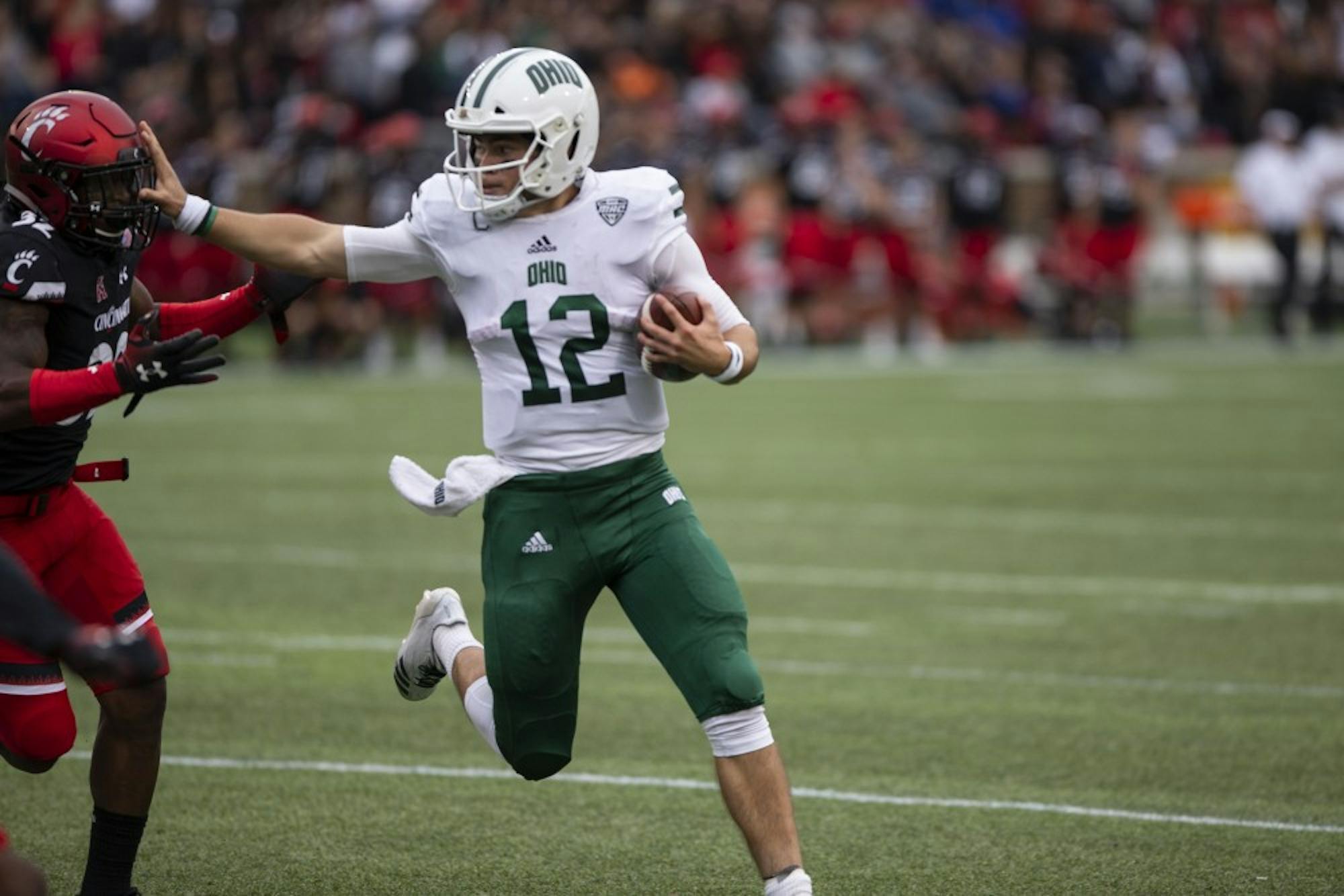 CINCINNATI — Nathan Rourke and the Ohio offense got the ball down by four points with 3:18 remaining Saturday. Ohio had blown a 21-point first half lead. Rourke was tasked with taking Ohio down the field and winning the game.