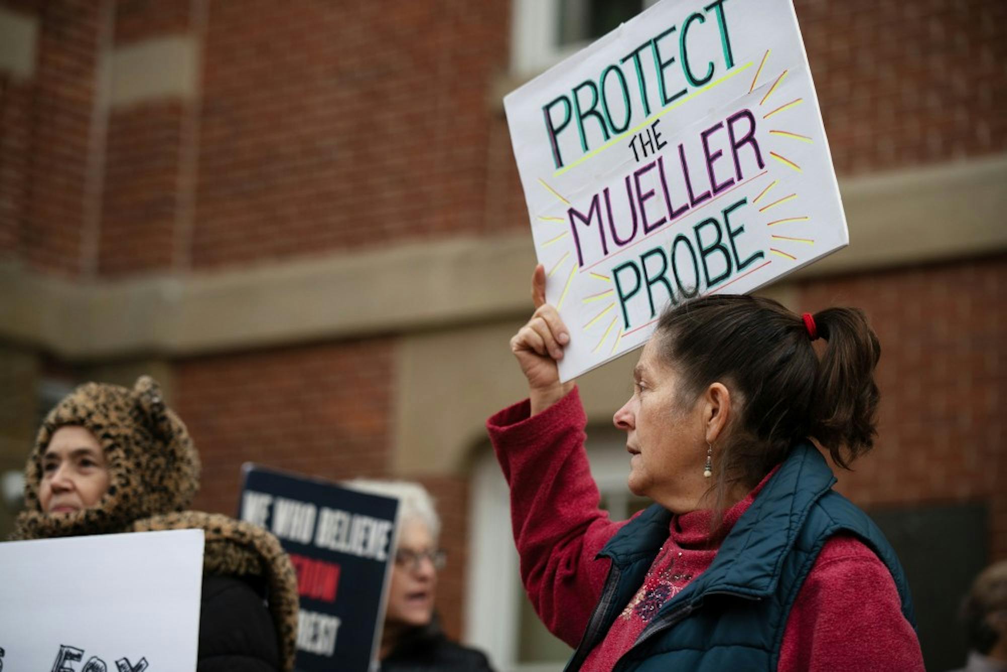 Mary Hogan, from Guysville, Ohio, waves a protest sign at the Save the Mueller Investigation protest outside the Athens County Courthouse on Nov. 8.