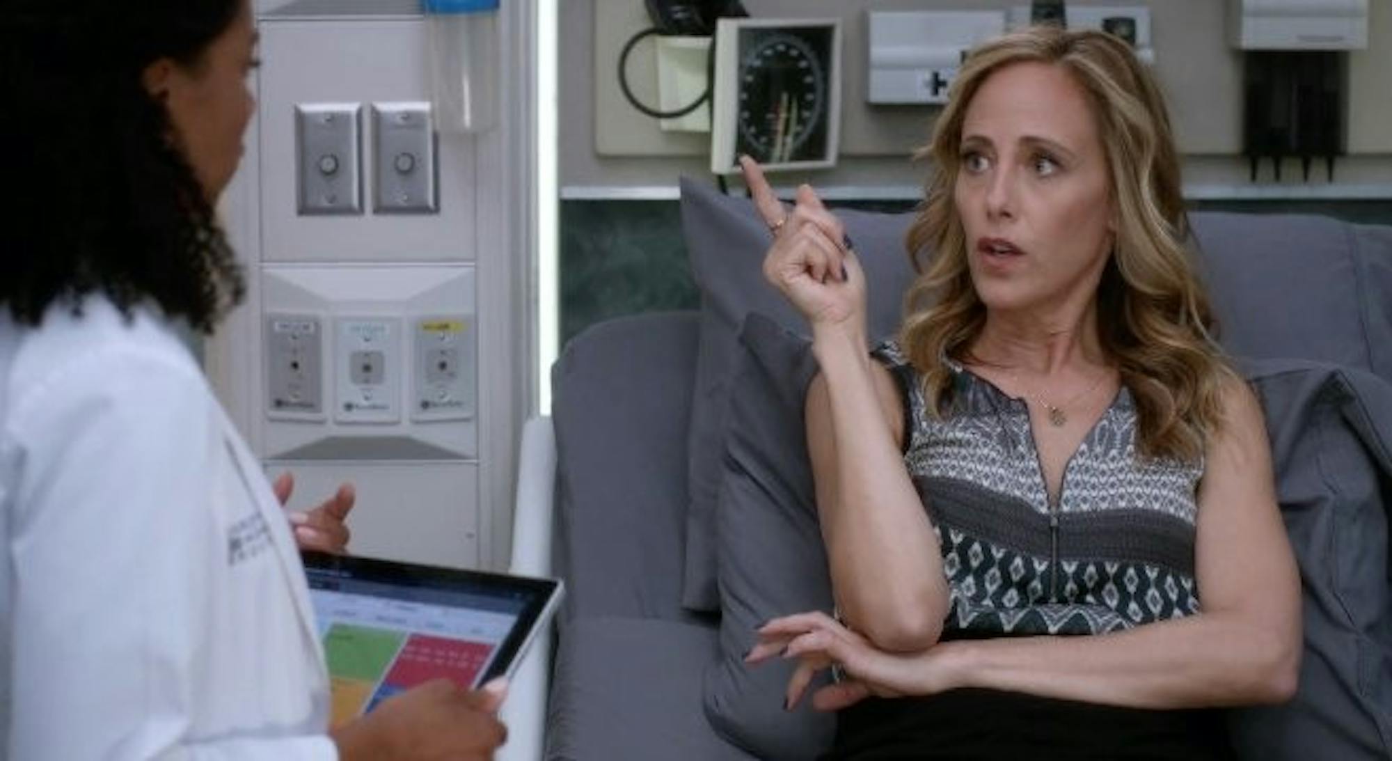 Teddy spent the whole episode in an inverted hospital bed with Owen by her side. Owen has had more practice being a parent because he recently got custody of Betty’s child Leo, so it seems Teddy is a little intimidated. She feels weird talking to the baby, so she calls her daughter soldier and orders it around. Owen forces her to loosen up.