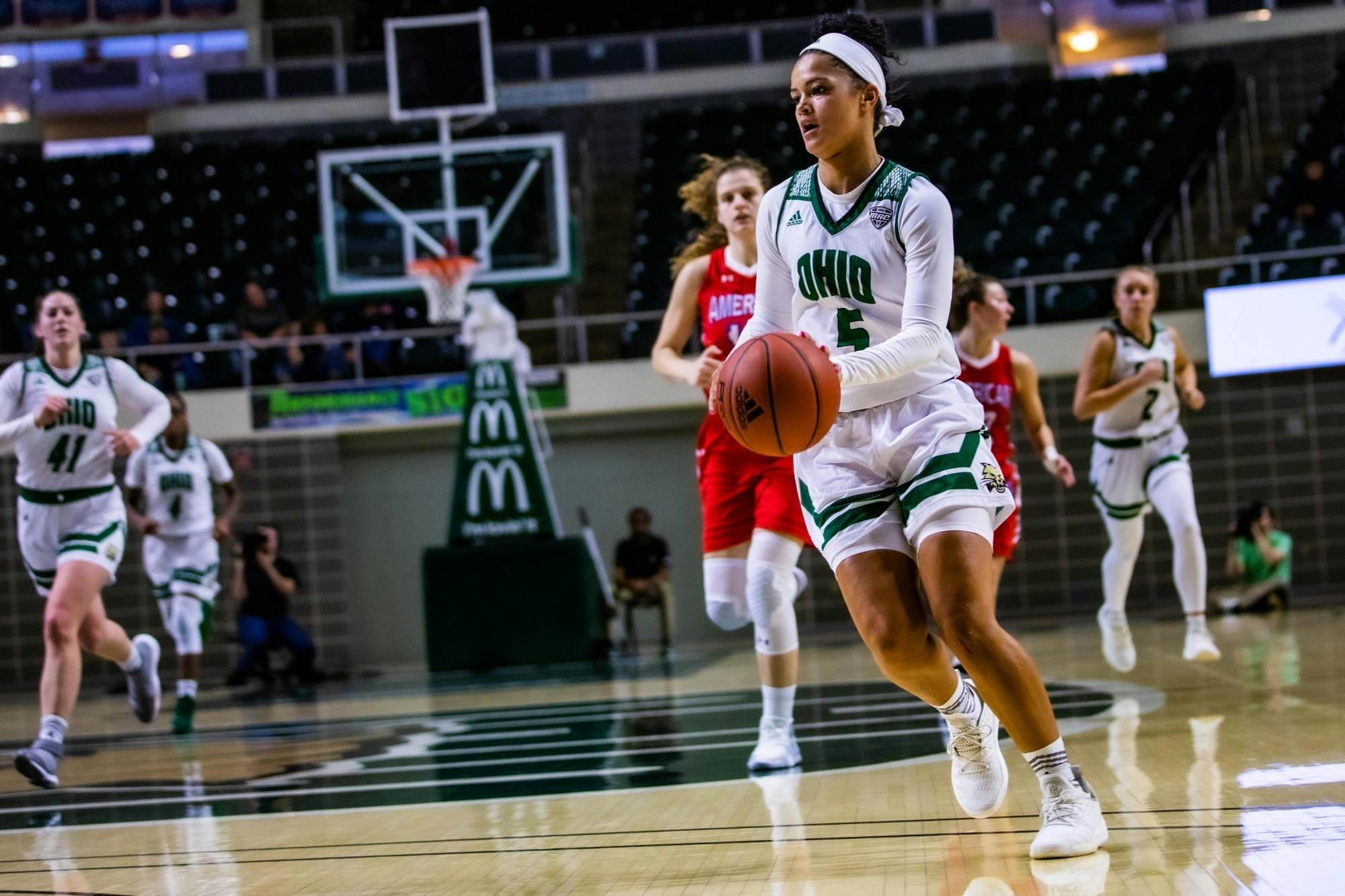 Ohio guard Caitlyn Kroll (no. 5) runs across court to help the Bobcats with their 81 - 69 victory against American University in the Convo on Sunday, Nov. 10, 2019.