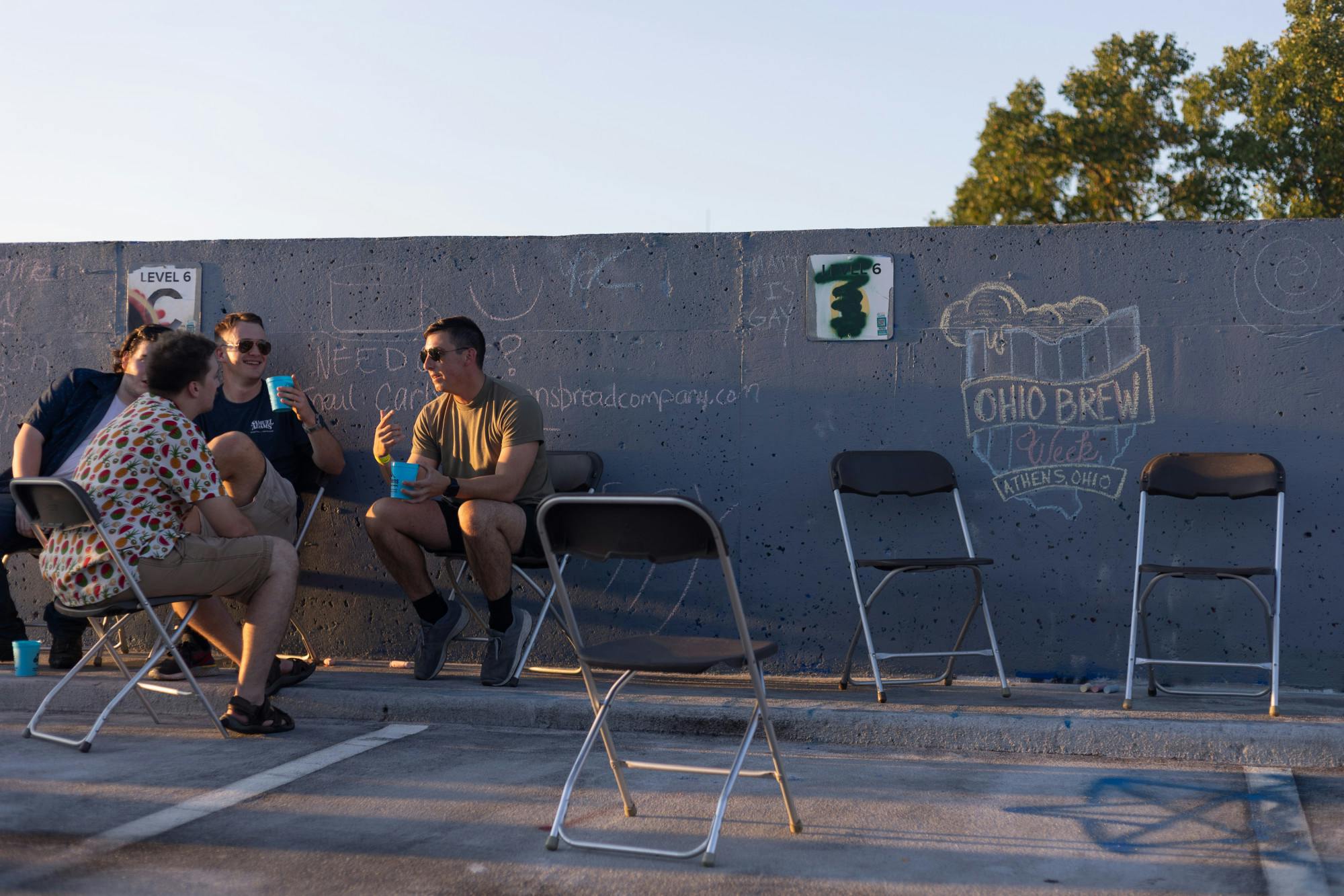 Alec Guay, Jacob Nause, Conner Wells,Irish Bateman talk at the Ohio Beer Week Fall Fest on top of the Parking Garage on Court Street in Athens, Ohio on September 9, 2022.