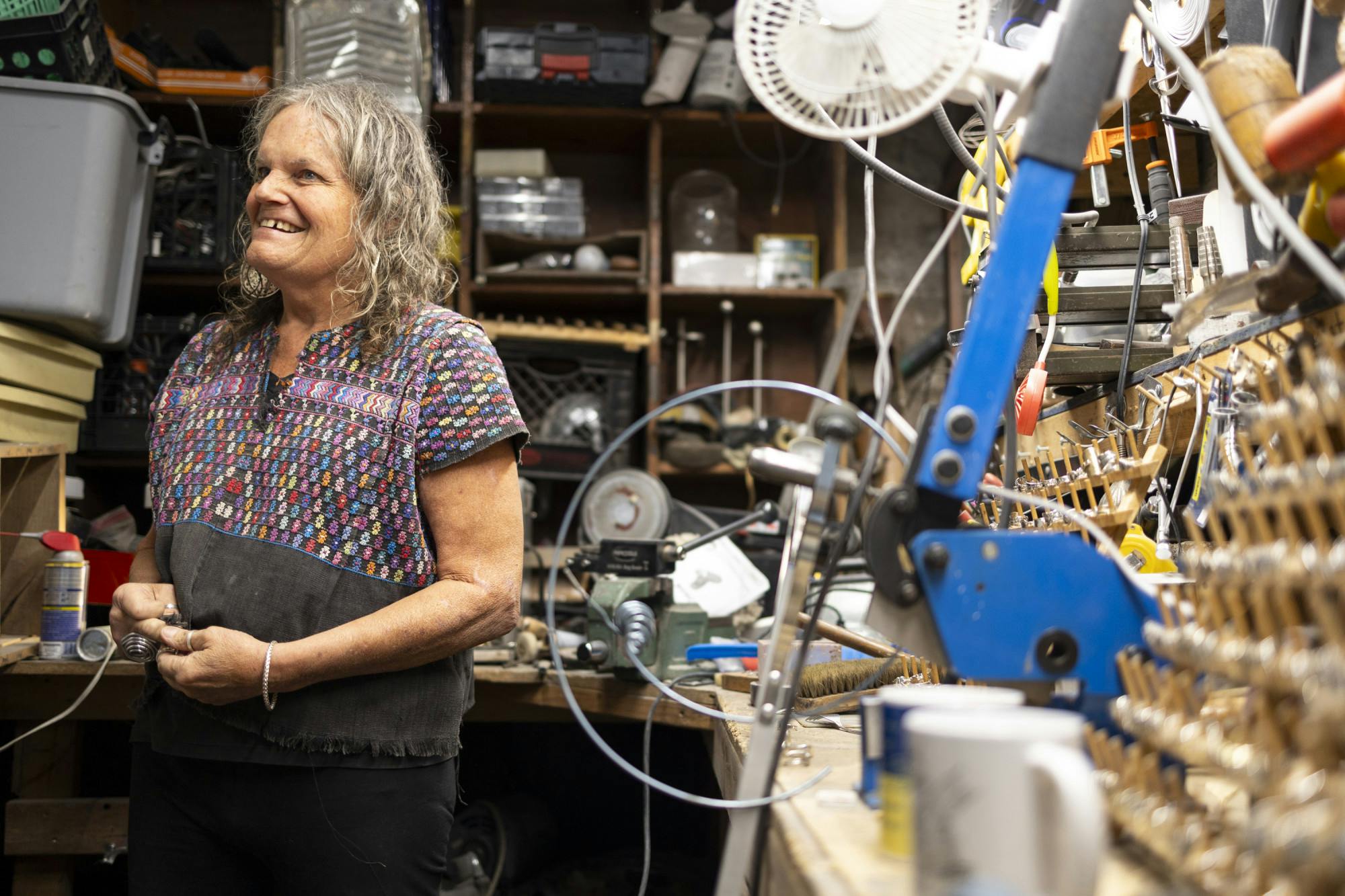 Cricket Jones shows her handmade silverware jewelry at her studio in Athens, Ohio. Oct, 17, 2023.