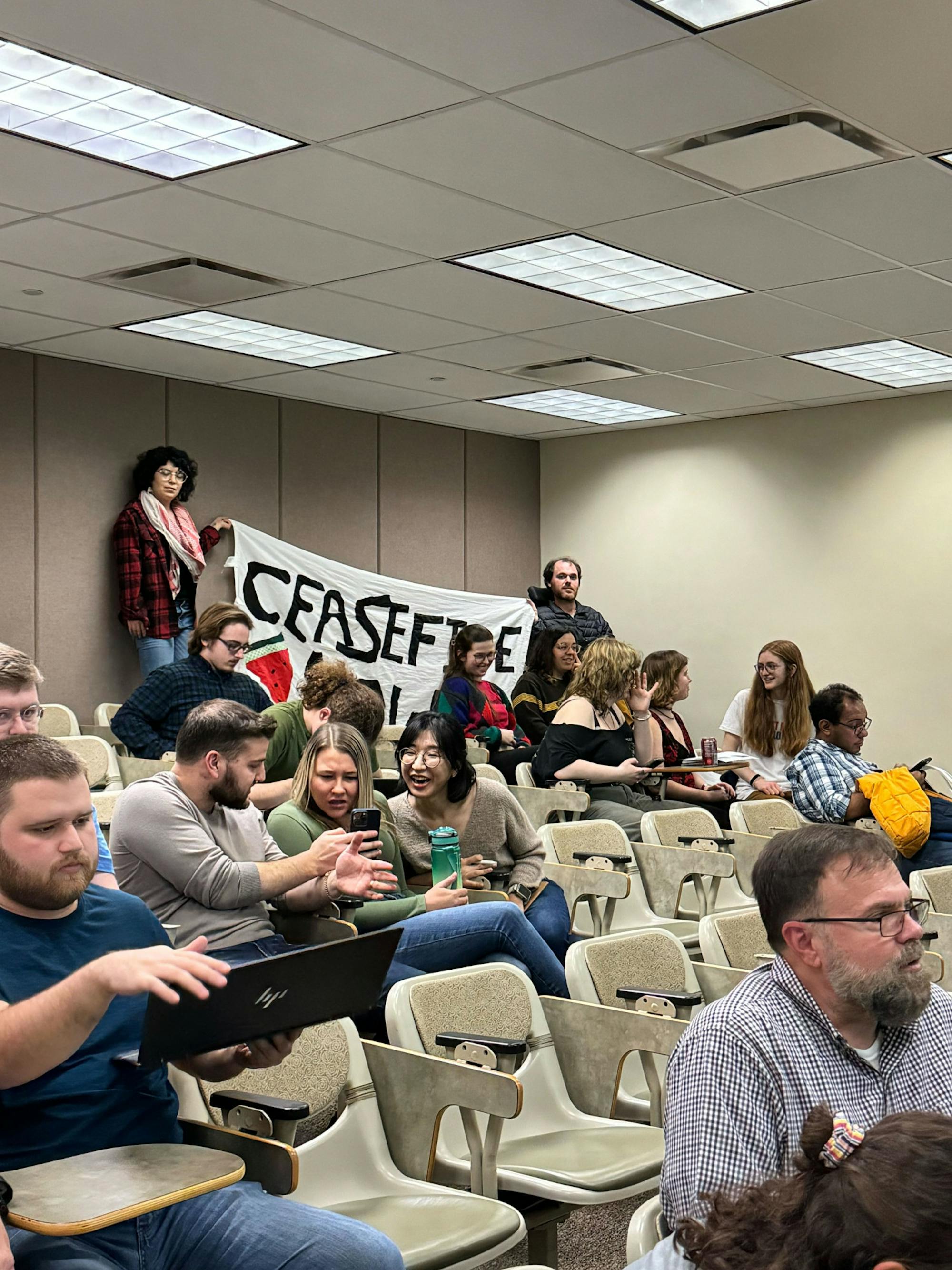 For the entirety of the meeting, a small group of people held up a banner in the back of the room that read “Ceasefire Now.” The people holding the sign refused to comment.