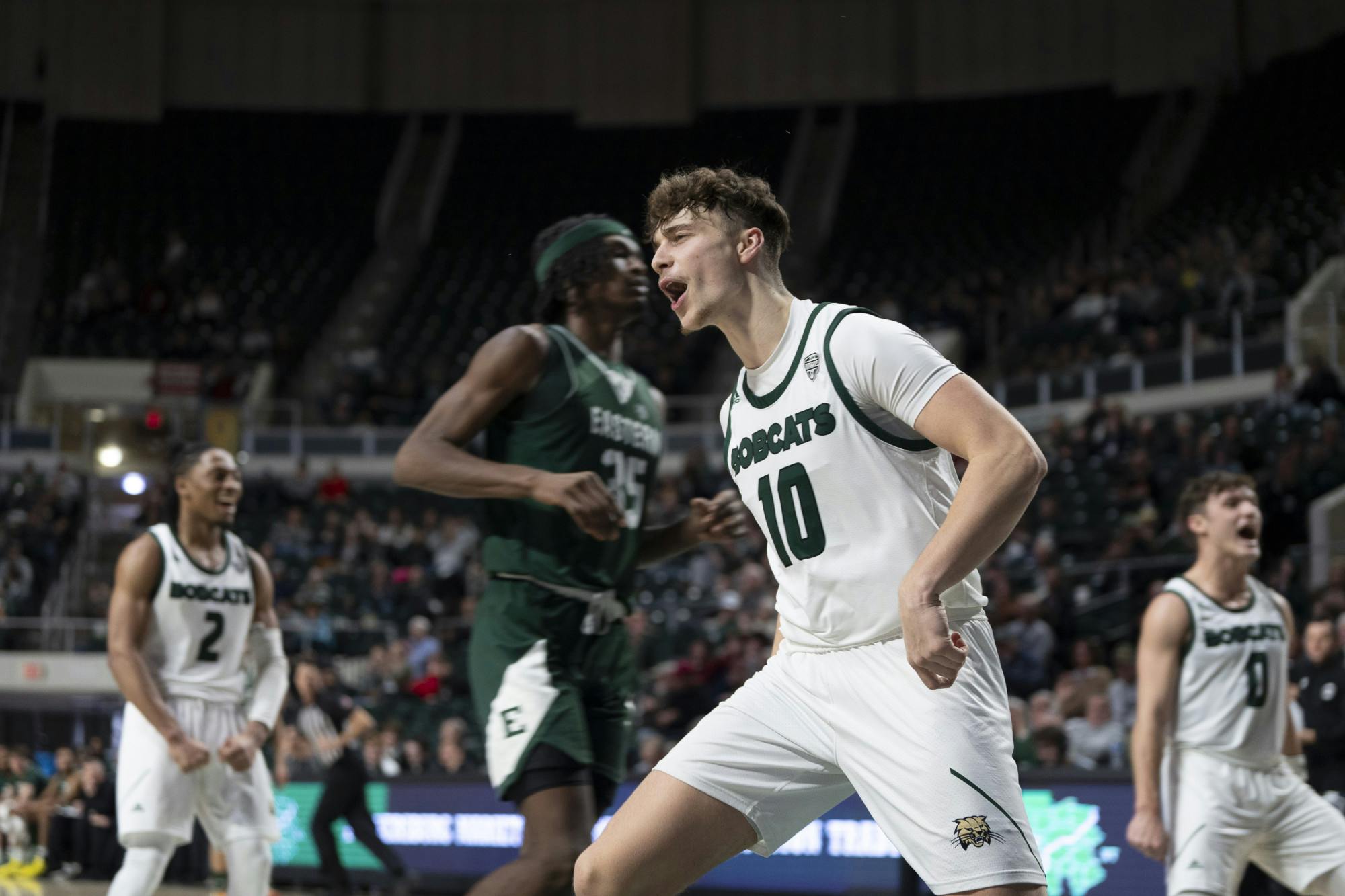 Aidan Hadaway (10) Foward position on Ohio Univeristy's Basketball Team celebrates after a reverse dunk at The Convo, in Athens, Ohio on Jan. 20, 2024.
