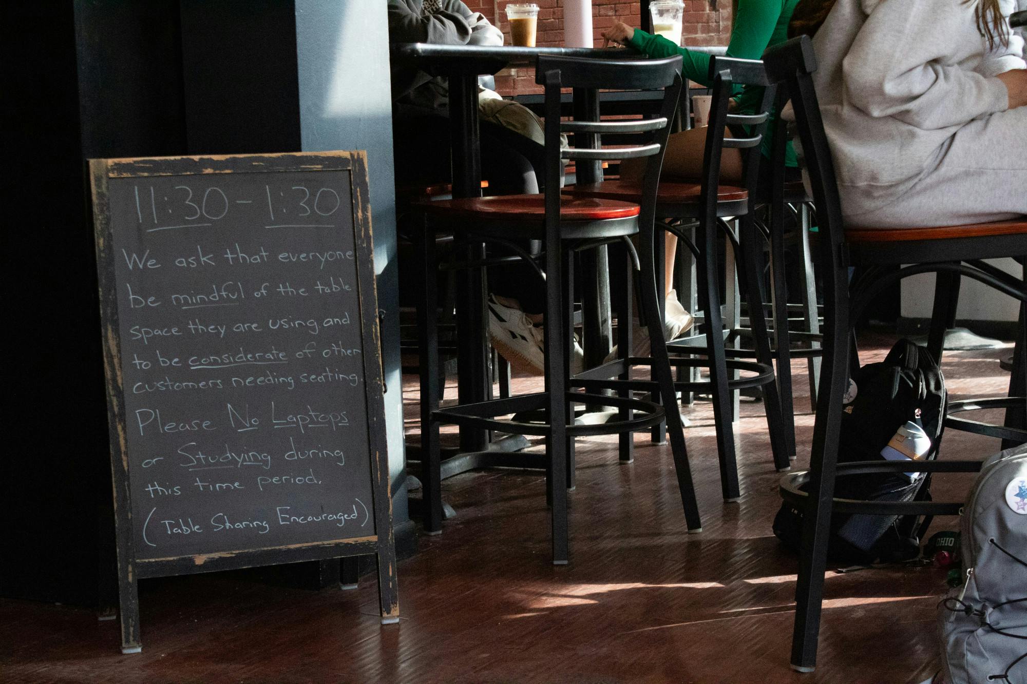 “We ask that everyone be mindful of the table space they are using and considerate of other customers needing seating. Please no laptops or studying during this period. Table sharing is encouraged,” the sign reads.