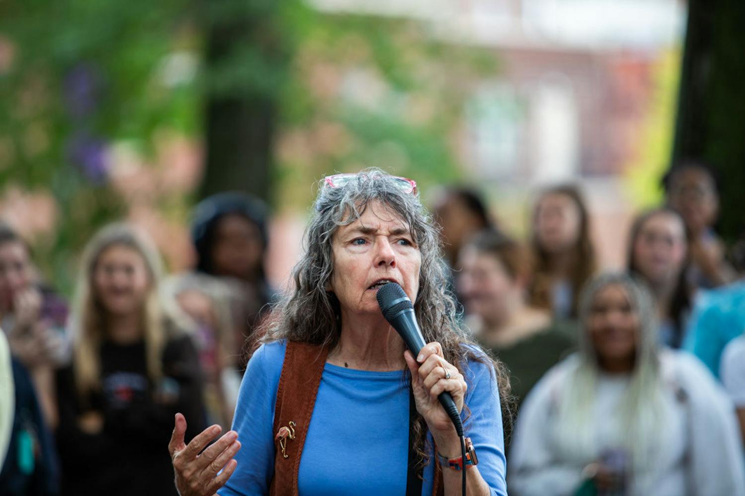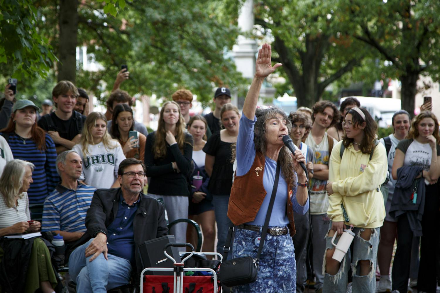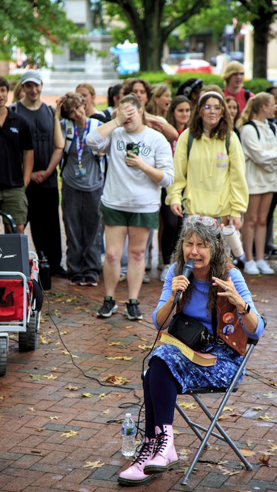 Evangelical preacher Cindy Smock, known as Sister Cindy on social media, visited Ohio University’s College Green on Wednesday, drawing a crowd of students who reacted with a mix of amusement and criticism.