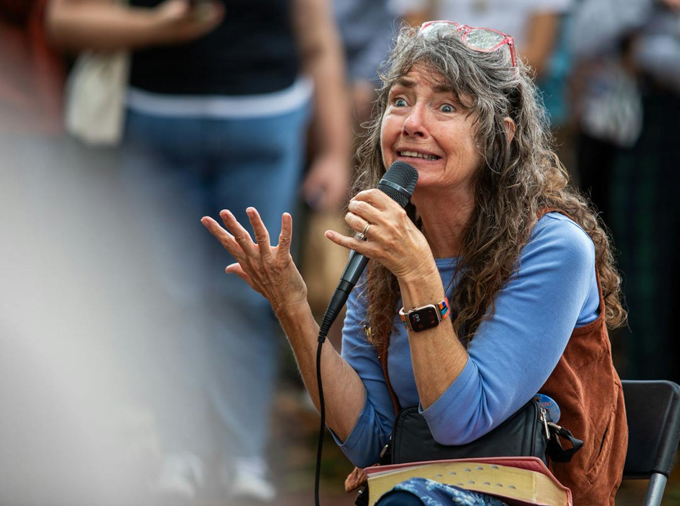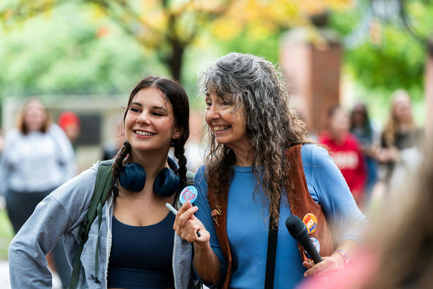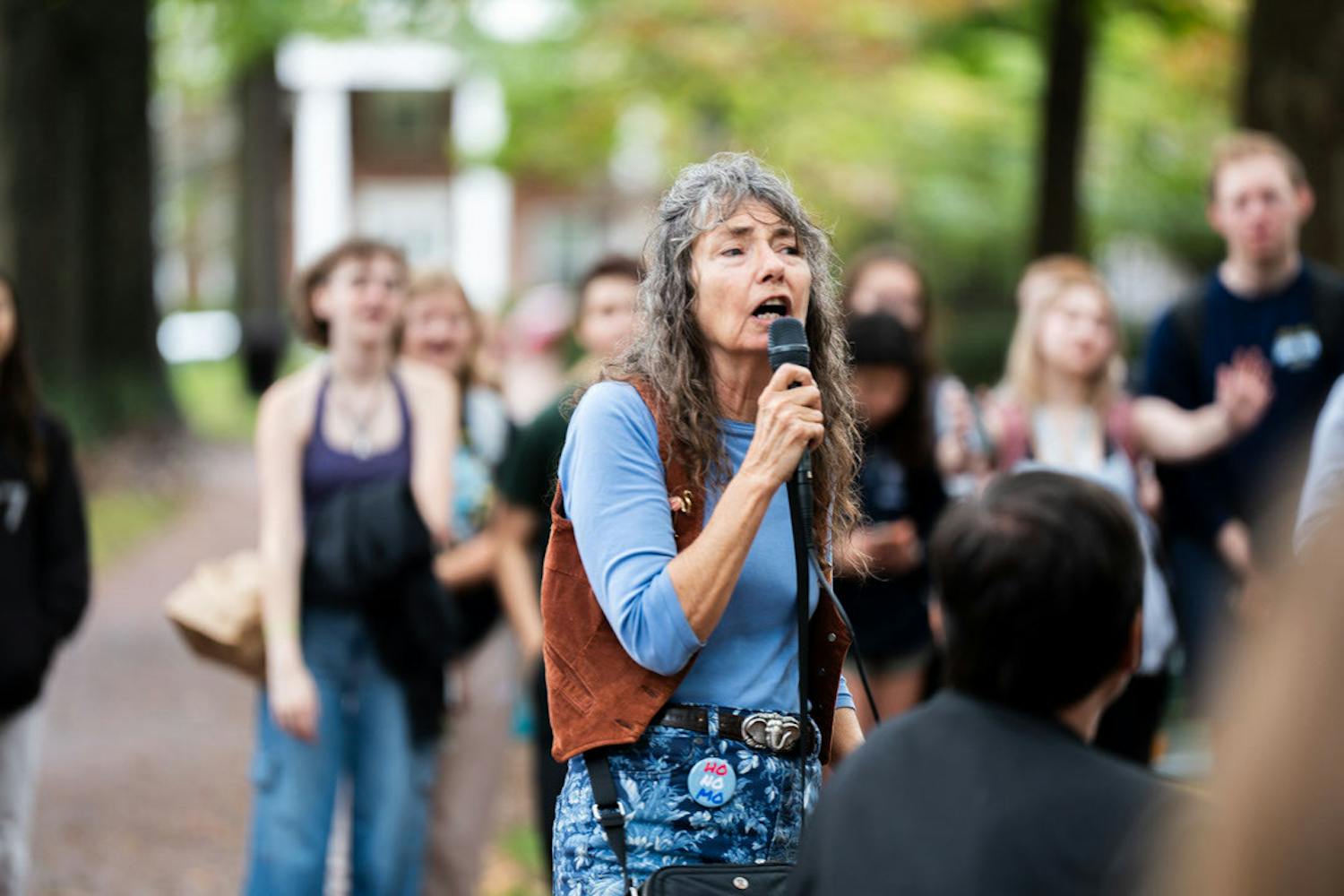 Evangelical preacher Cindy Smock, known as Sister Cindy on social media, visited Ohio University’s College Green on Wednesday, drawing a crowd of students who reacted with a mix of amusement and criticism.