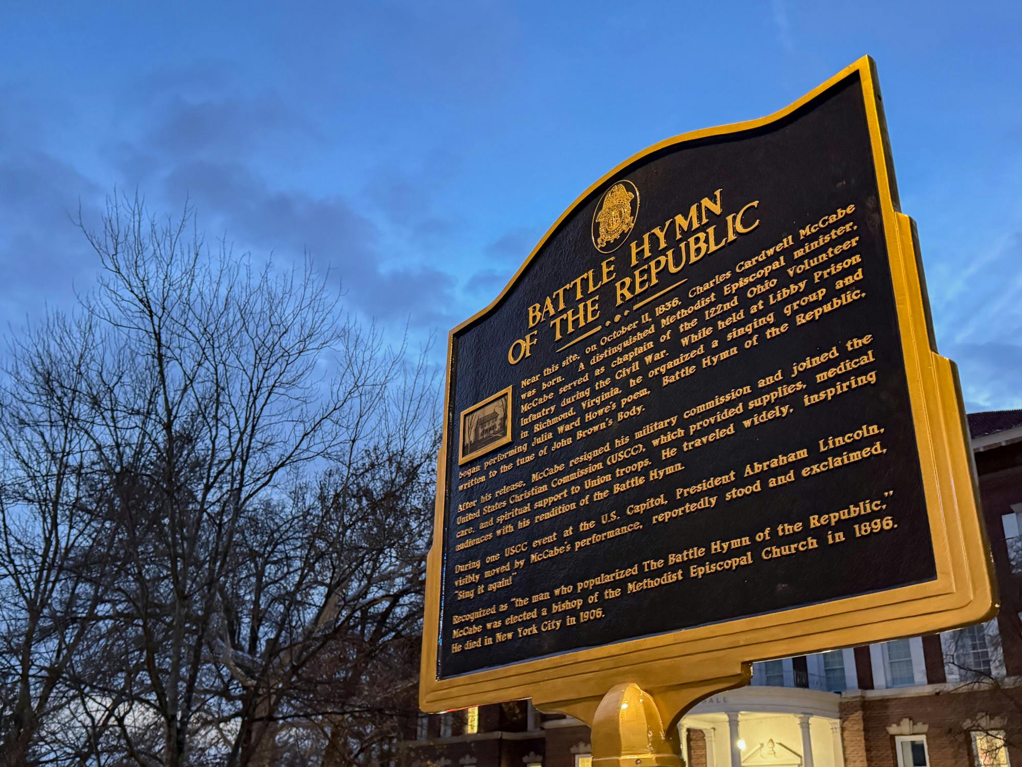 The marker commemorates the land where Charles Cardwell McCabe was raised, a distinguished minister and chaplain of the Ohio Volunteer Infantry during the Civil War. McCabe is known as “the man who popularized the Battle Hymn of the Republic,” according to the marker.