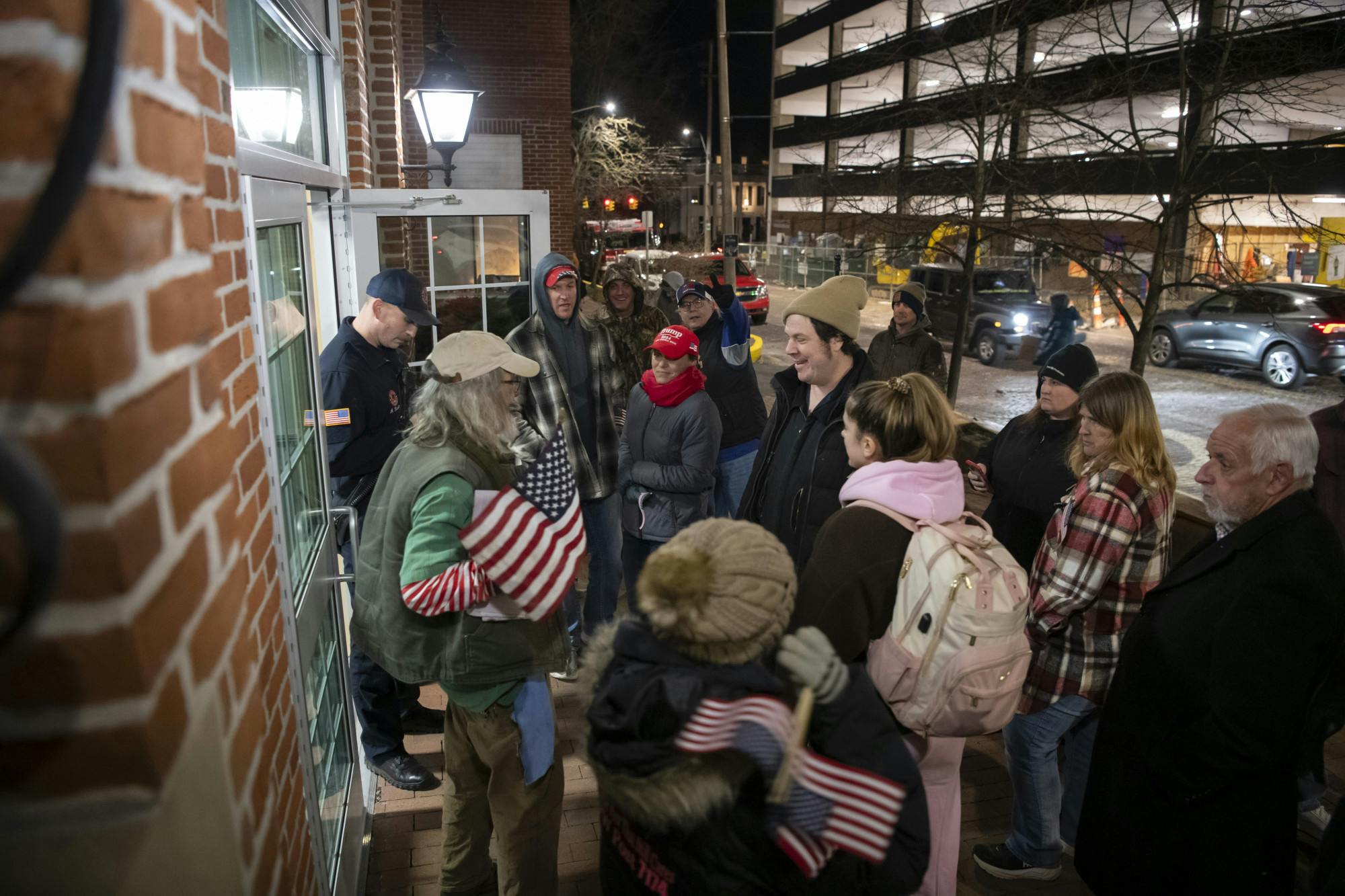 Athens residents wait outside the Athens City Building prior to a city council meeting on Tuesday, Jan. 20, 2025, after the meeting room had reached capacity.