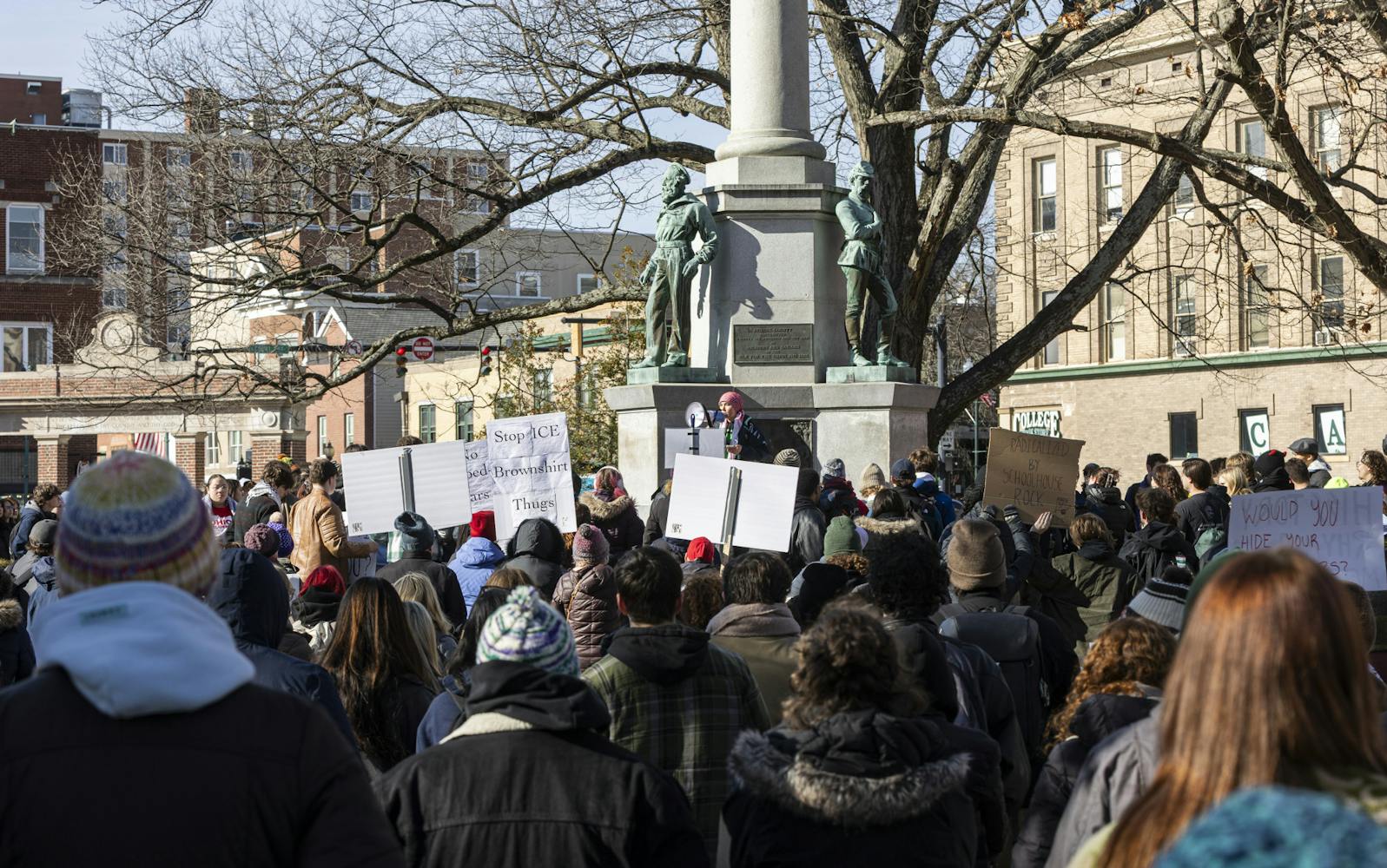 Protestors hold up signs during a "No I.C.E." protest on College Green in Athens, Jan. 23, 2026.