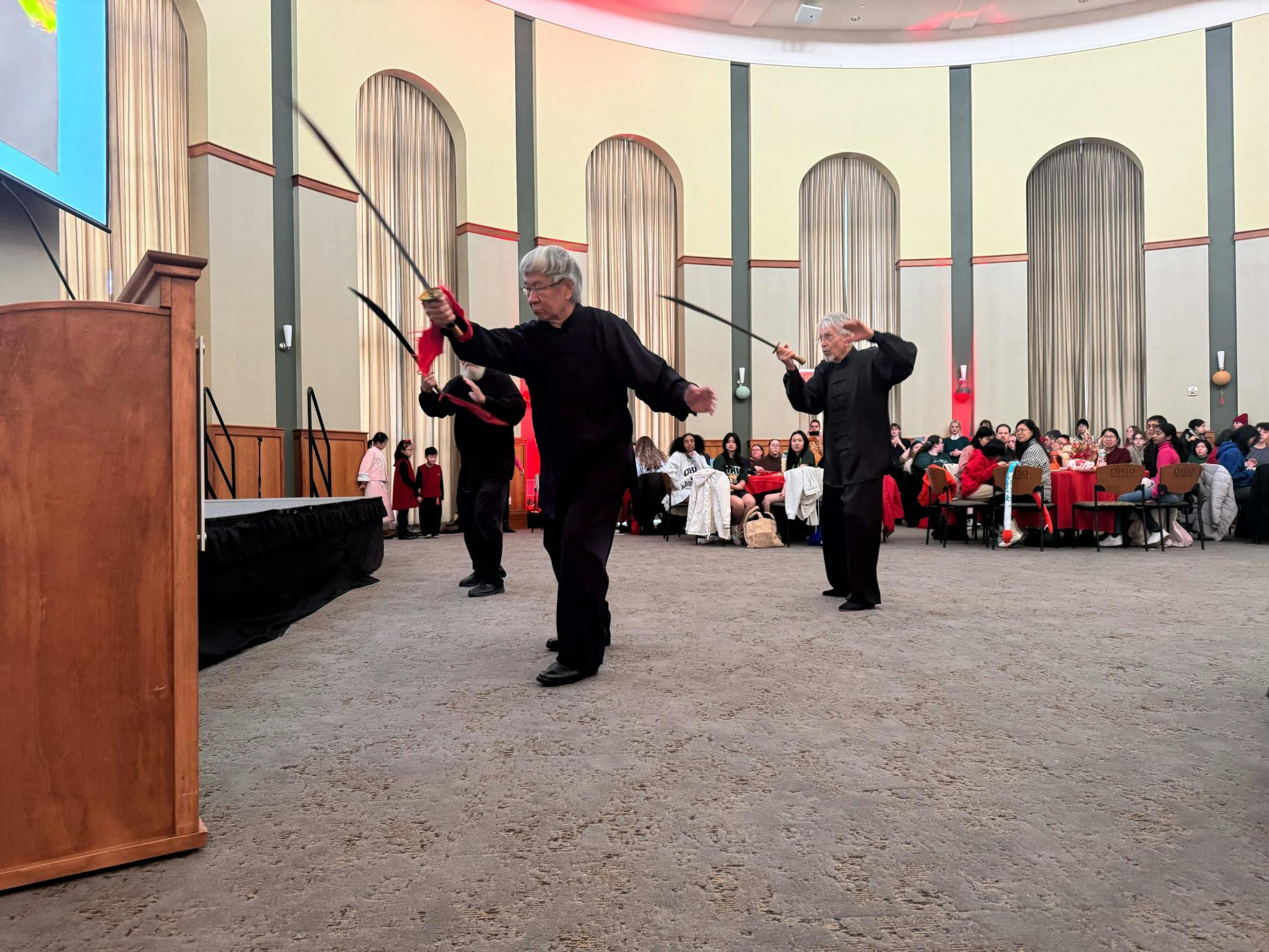 Ohio University Baker Center Ballroom filled with chattering people Sunday. Attendees arrived, sitting at the many circular tables draped with red tablecloths and anticipating an afternoon of delicious food and dance to celebrate Chinese Lunar New Year.