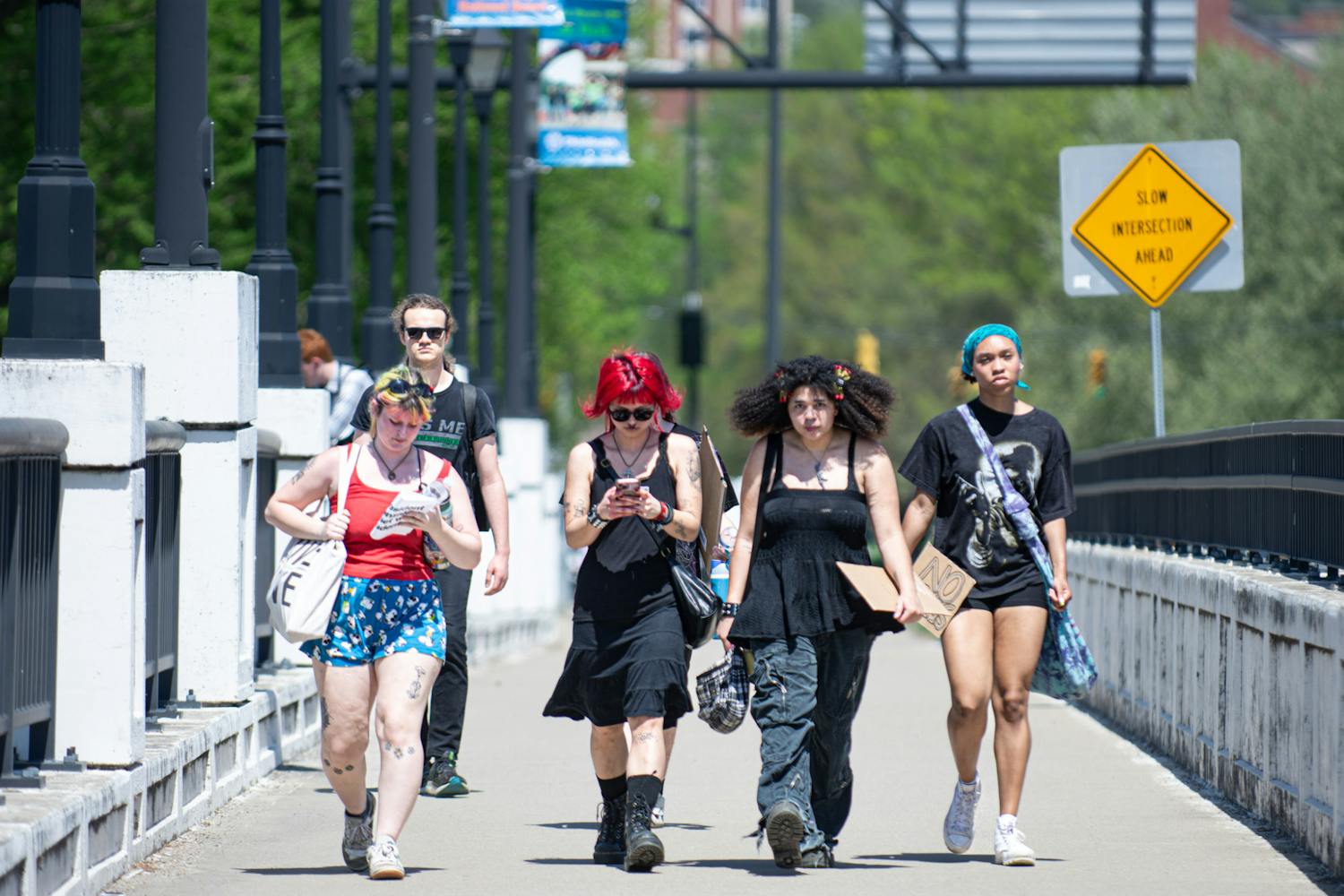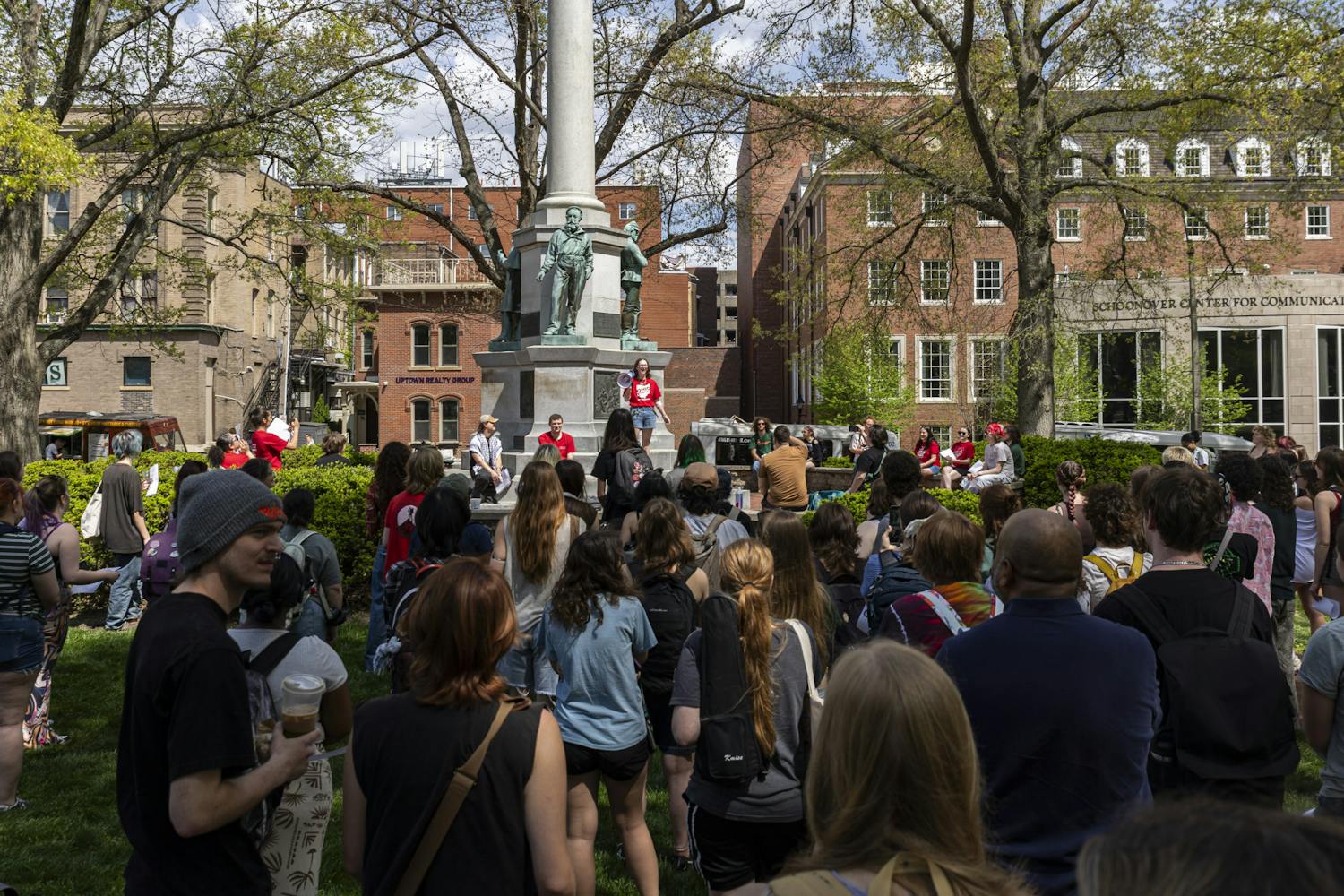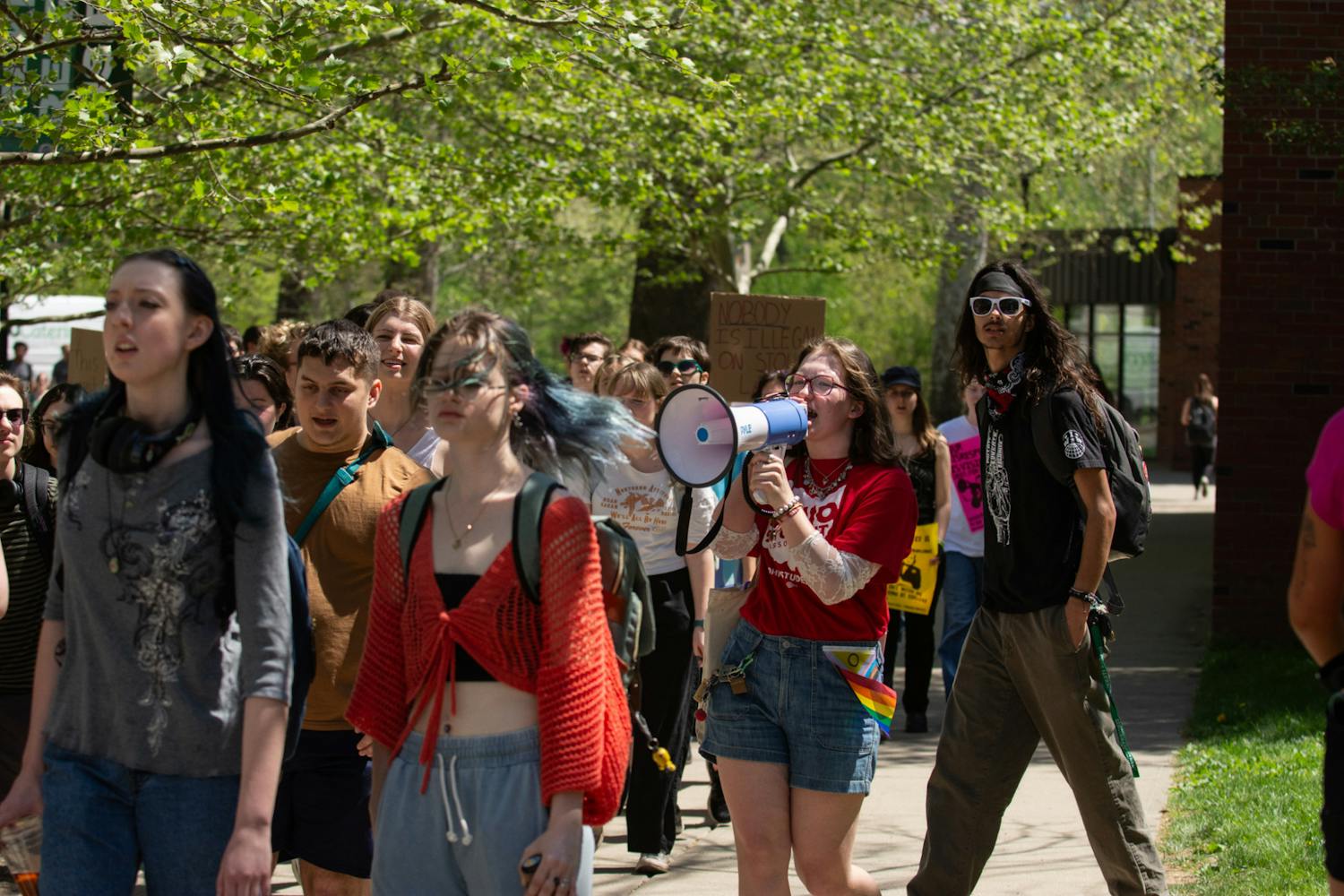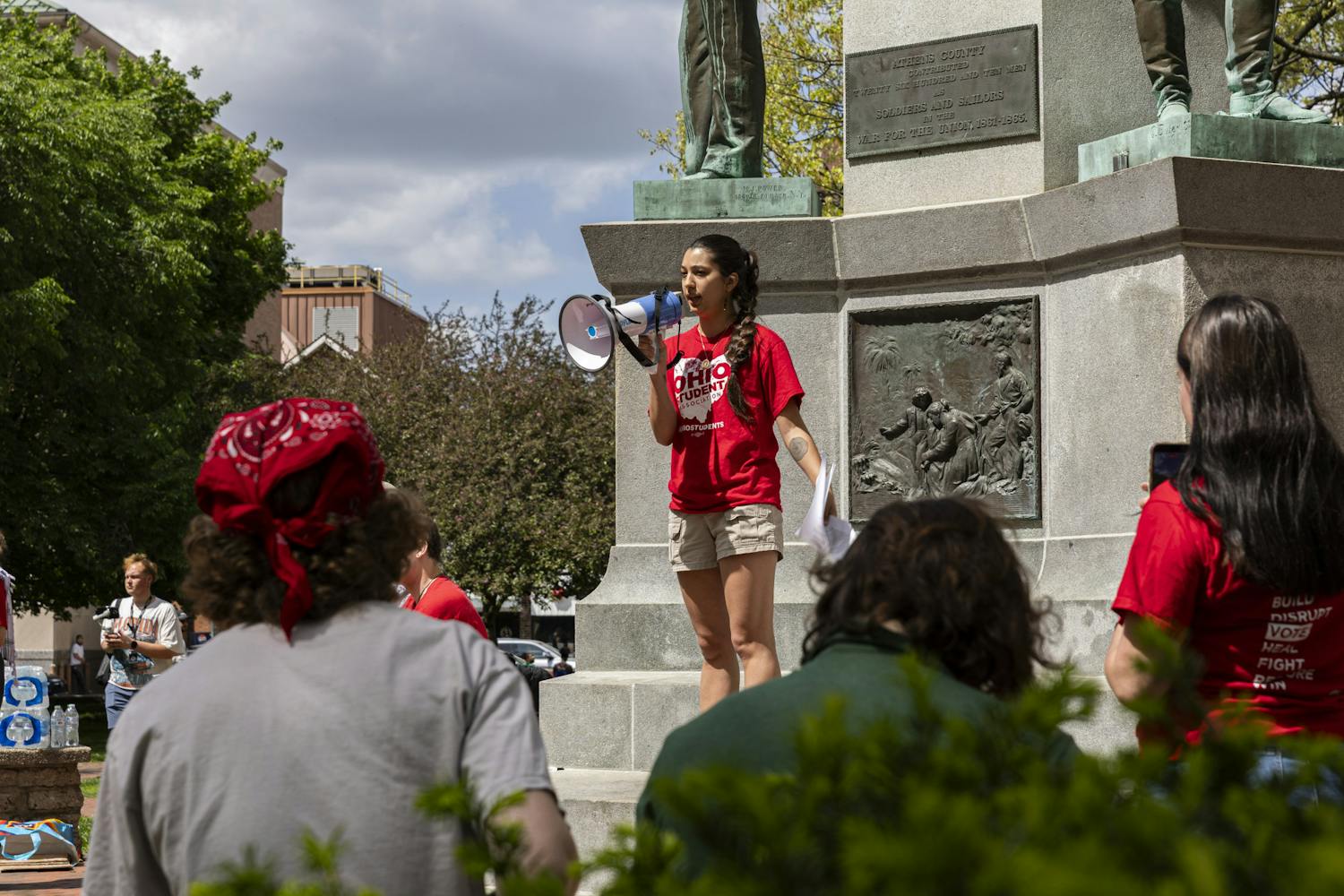 The demonstration began at noon at the Soldiers and Sailors Monument, where speakers addressed the crowd and outlined concerns, including Senate Bill 1, immigration enforcement, United Academics of Ohio University negotiations and a student referendum on university transparency.