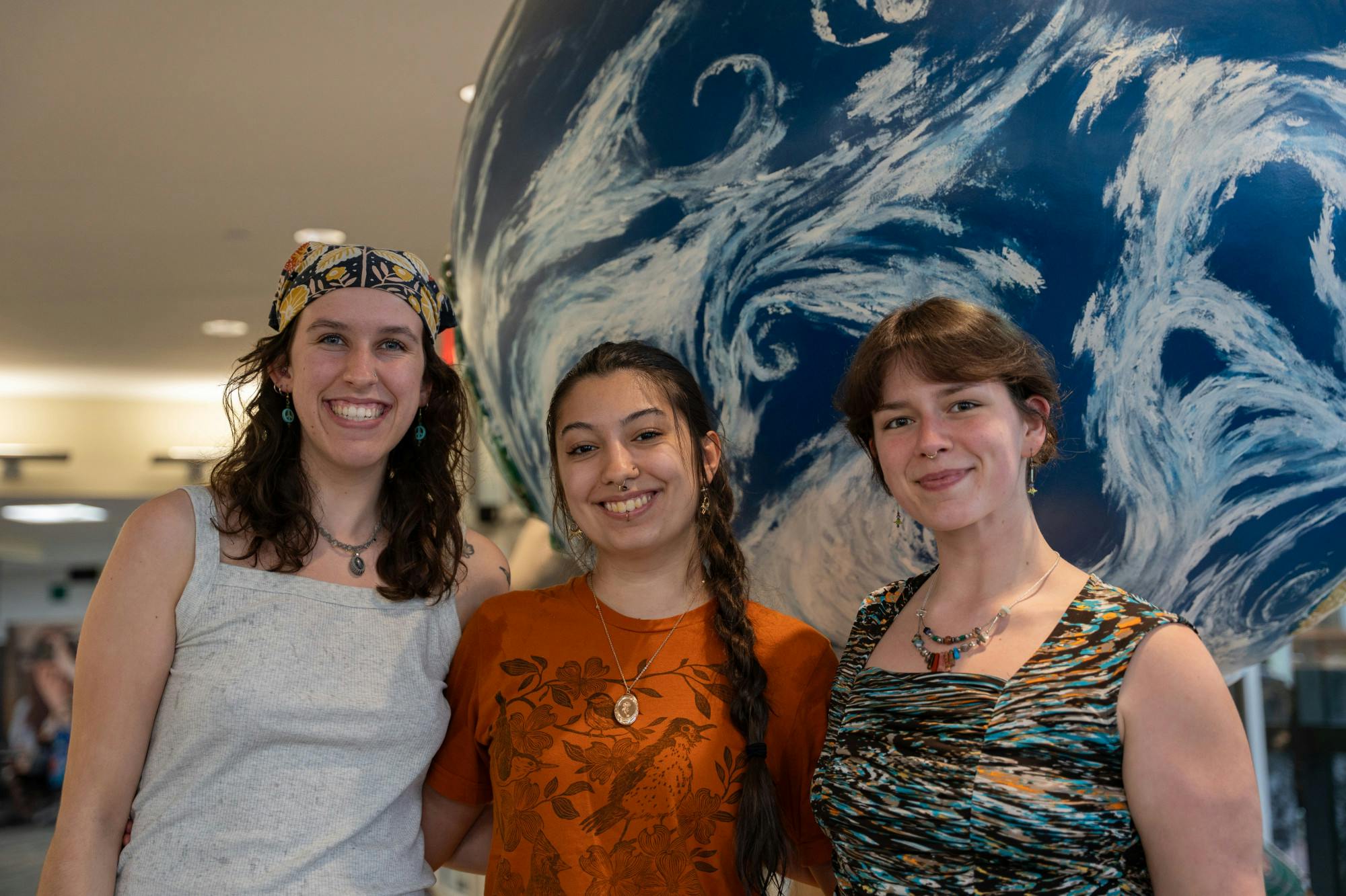 Executive members of Ohio University's chapter of Fridays for Future, Clare Haddon (left) Jaidyn Hughes (middle) and Jada Townsend (right), stand for a portrait in Schoonover Center, April 1, 2026, in Athens.