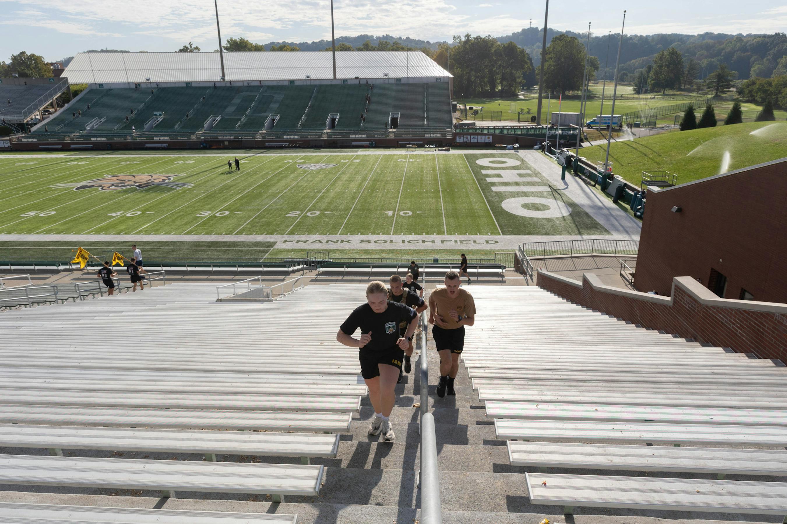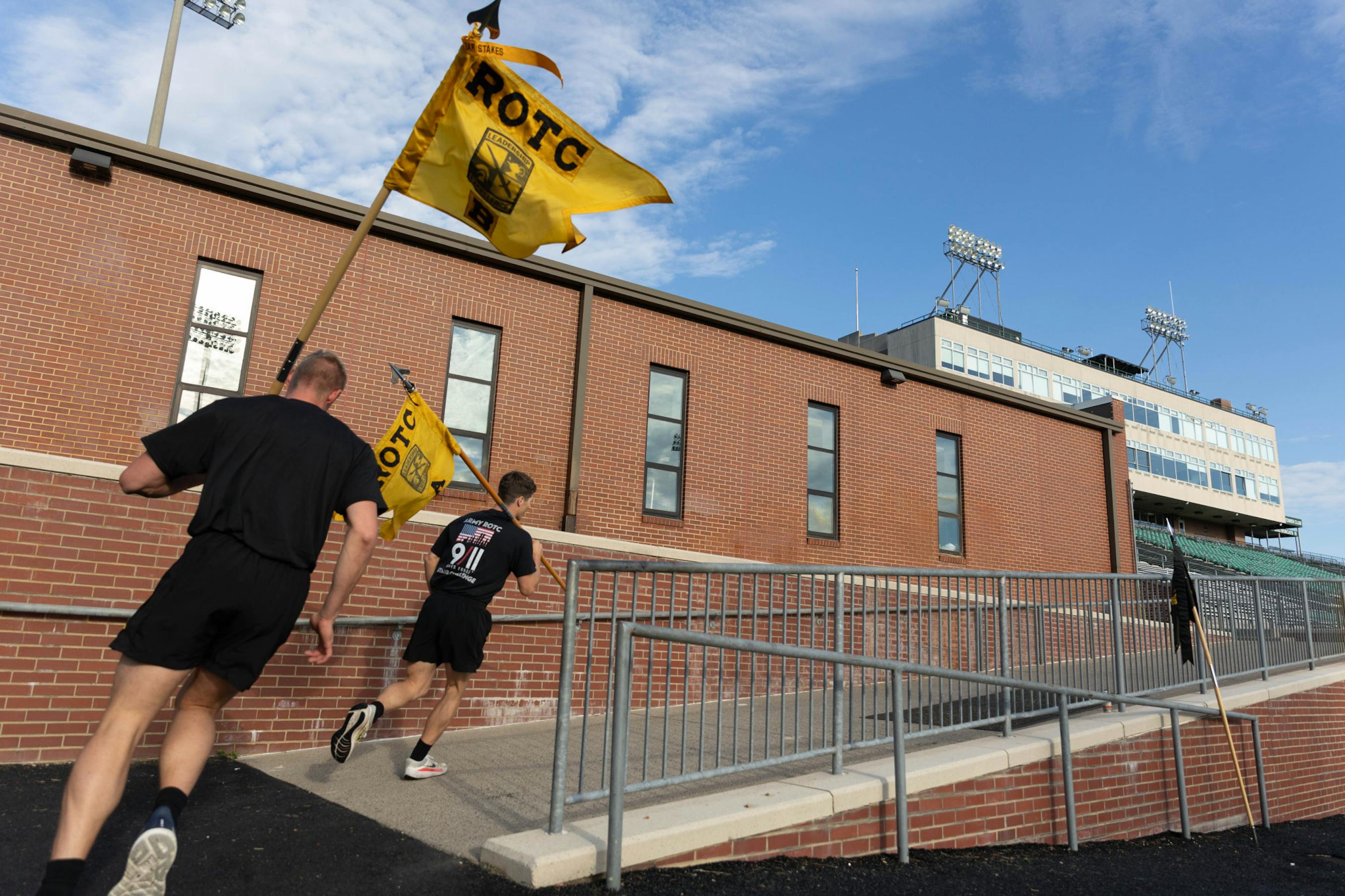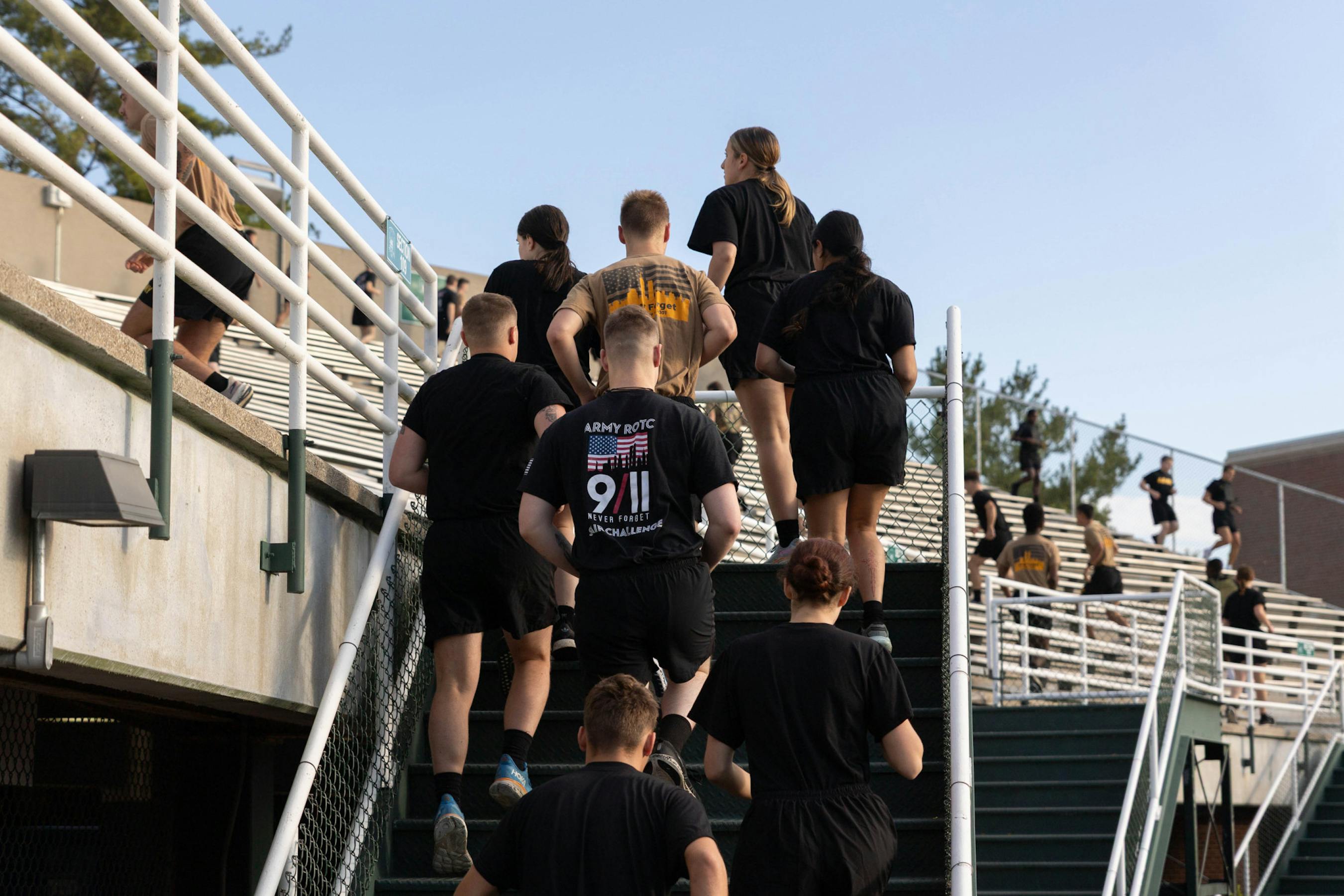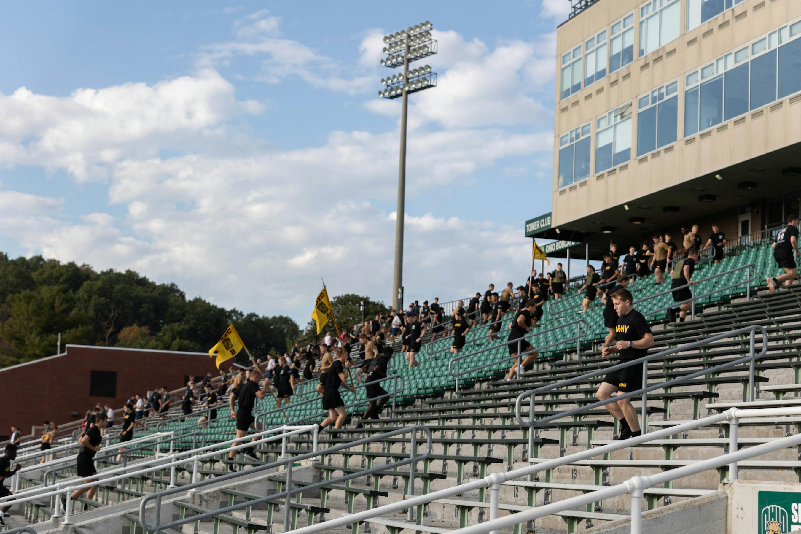 Bobcat Battalion cadets and first responders participate in the 9/11 Stair Challenge in Peden Stadium at Ohio University in Athens, Sept. 11, 2025. The challenge is to remember the FDNY fire fighters who climbed 2,200 steps and 110 stories at the World Trade Center Towers. The cannon is fired during the start, when the second plane hit and for the final lap.