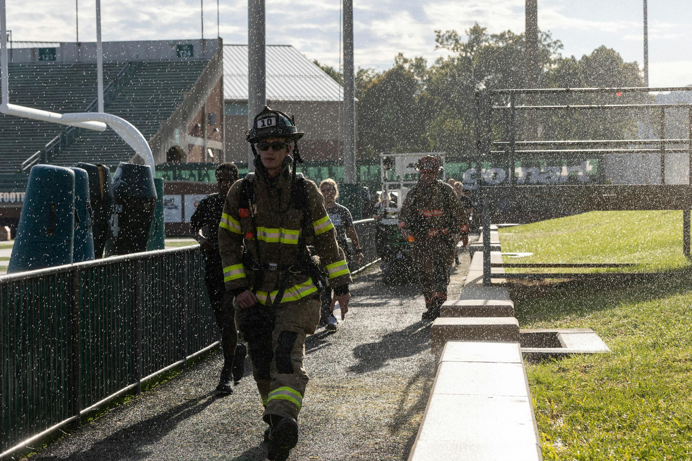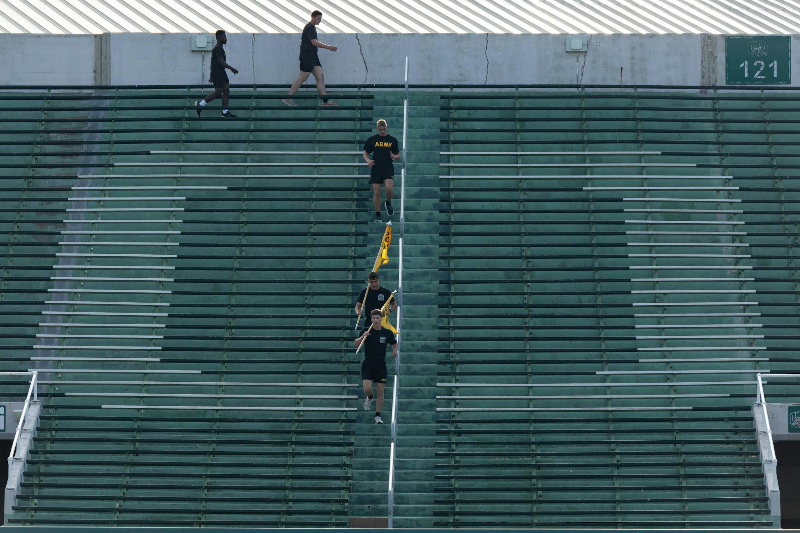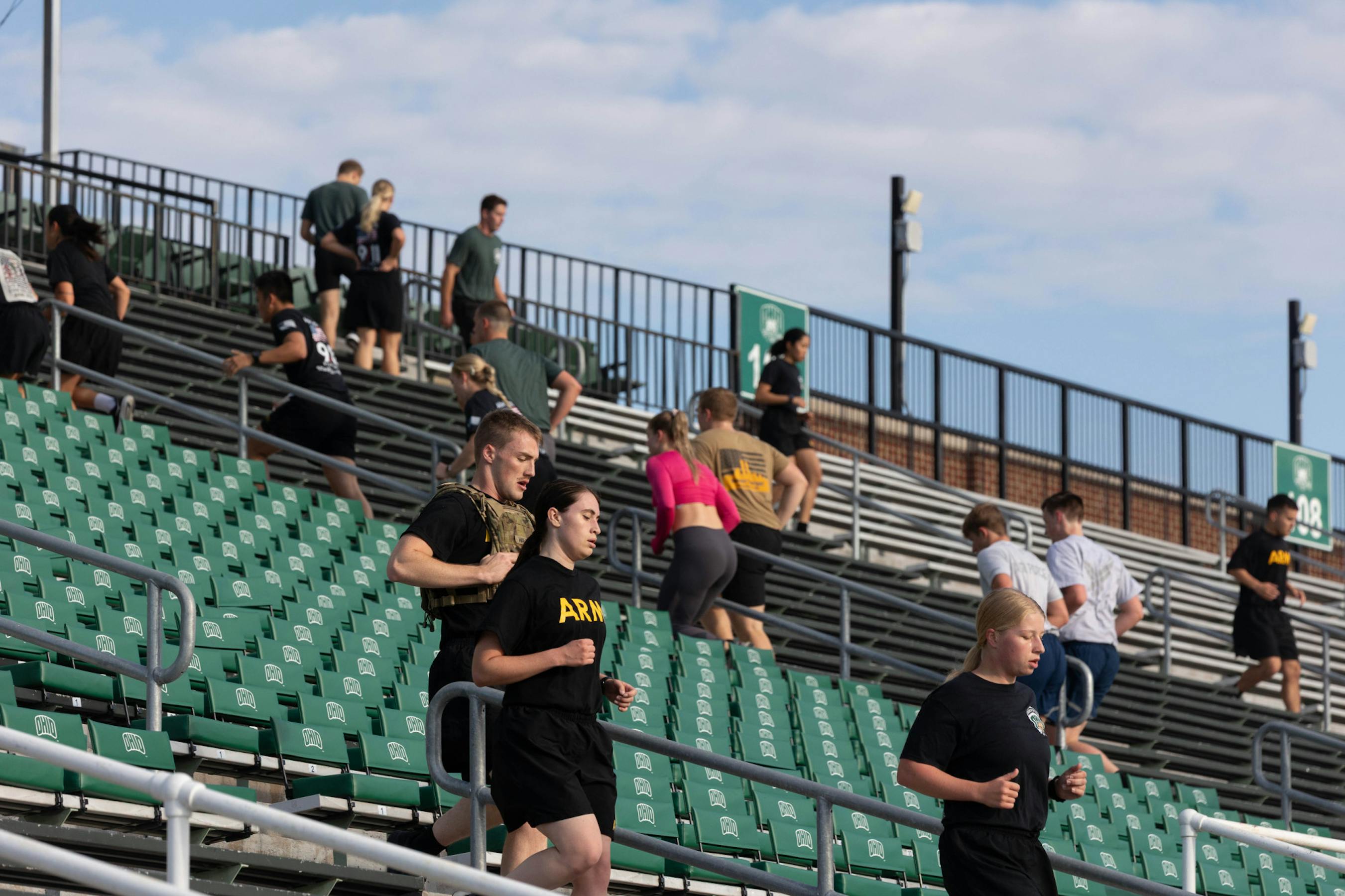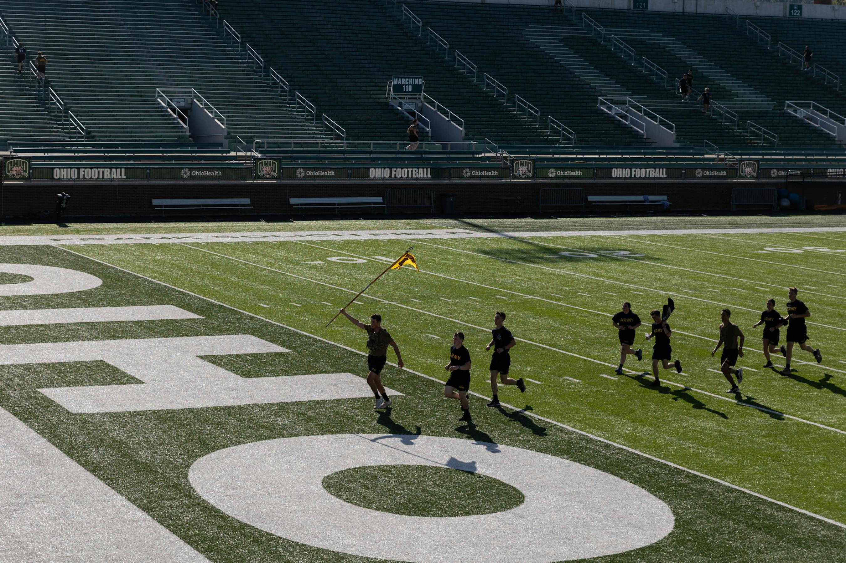 Bobcat Battalion cadets and first responders participate in the 9/11 Stair Challenge in Peden Stadium at Ohio University in Athens, Sept. 11, 2025. The challenge is to remember the FDNY fire fighters who climbed 2,200 steps and 110 stories at the World Trade Center Towers. The cannon is fired during the start, when the second plane hit and for the final lap.