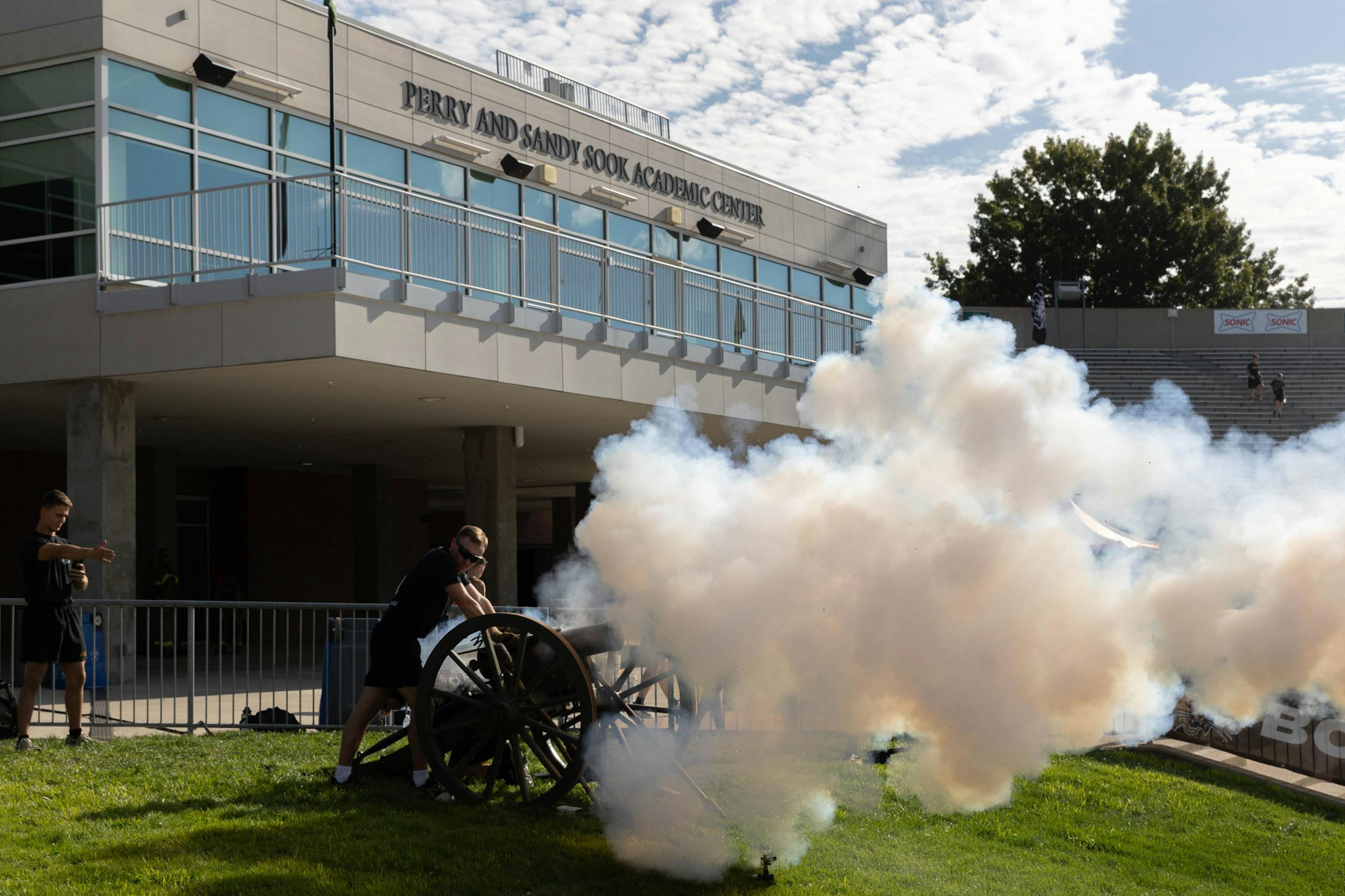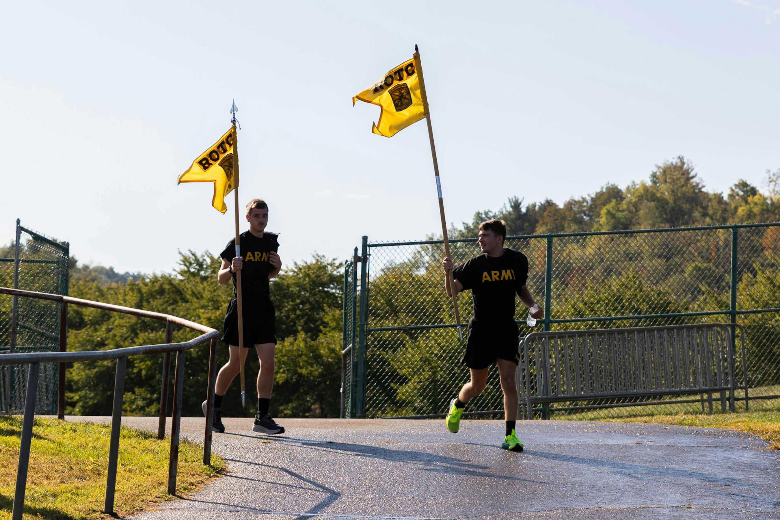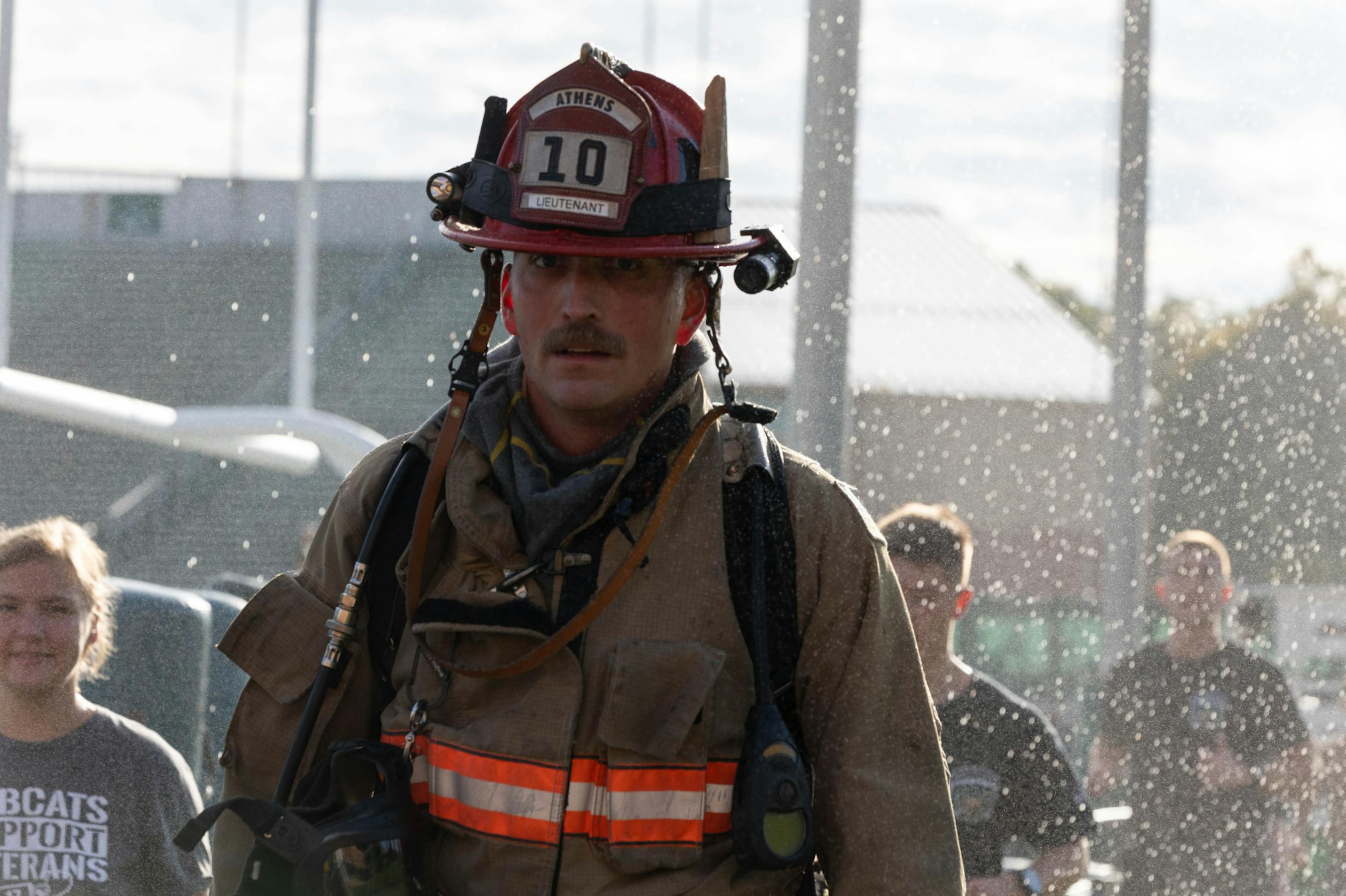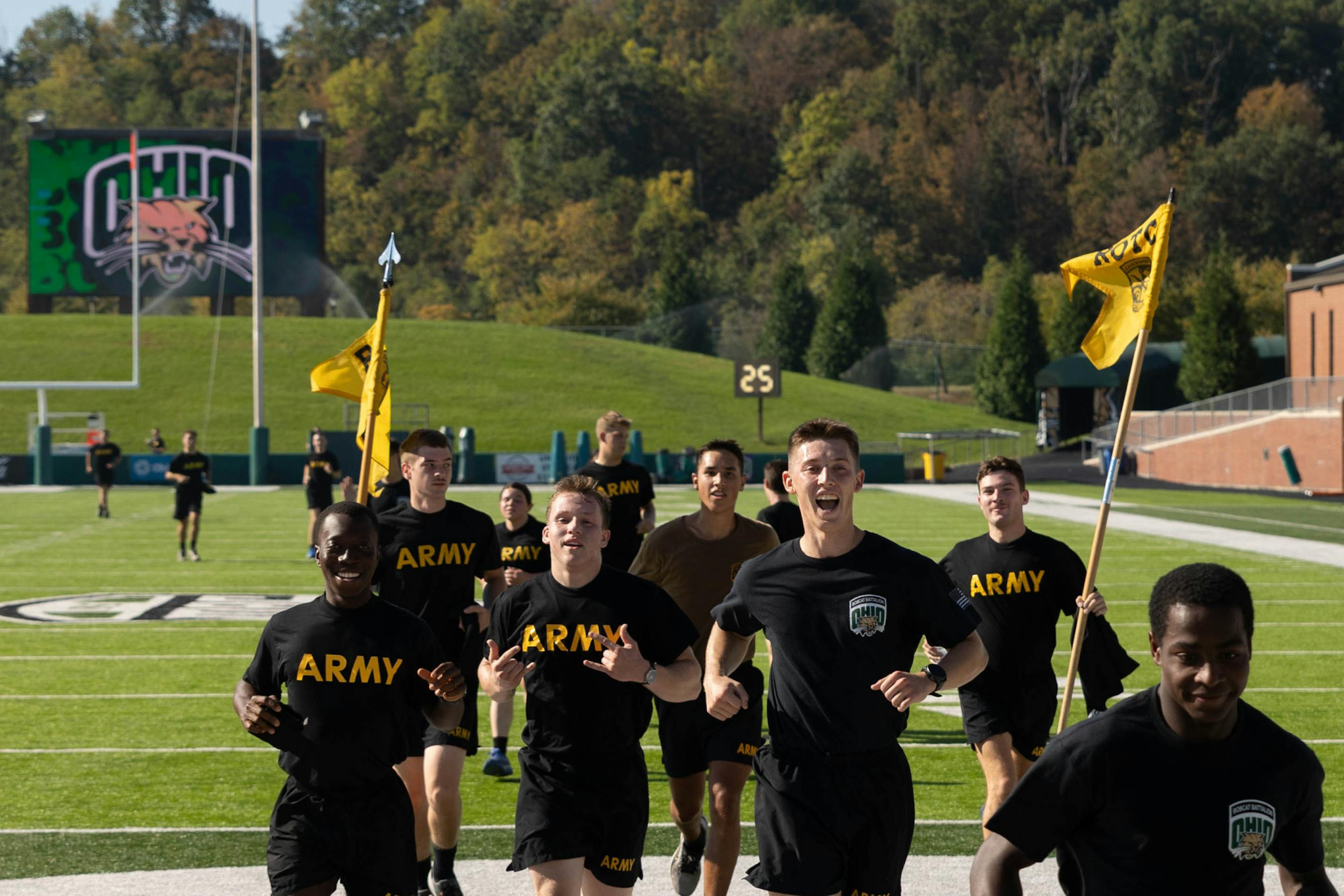 Bobcat Battalion cadets and first responders participate in the 9/11 Stair Challenge in Peden Stadium at Ohio University in Athens, Sept. 11, 2025. The challenge is to remember the FDNY fire fighters who climbed 2,200 steps and 110 stories at the World Trade Center Towers. The cannon is fired during the start, when the second plane hit and for the final lap.