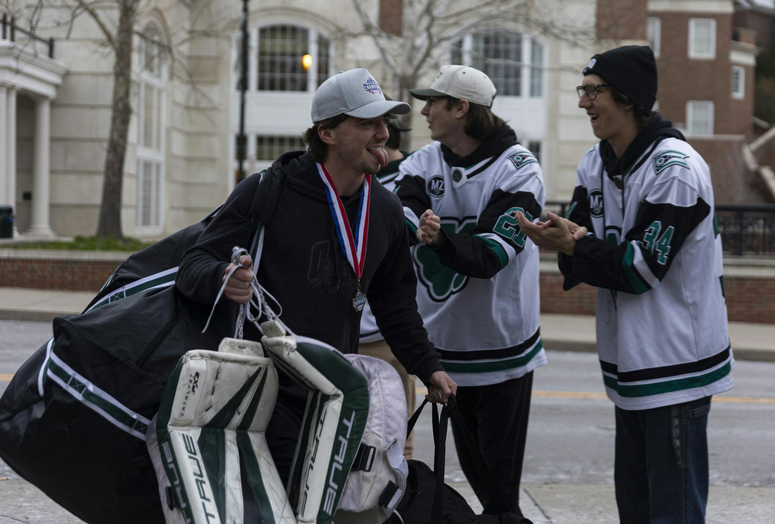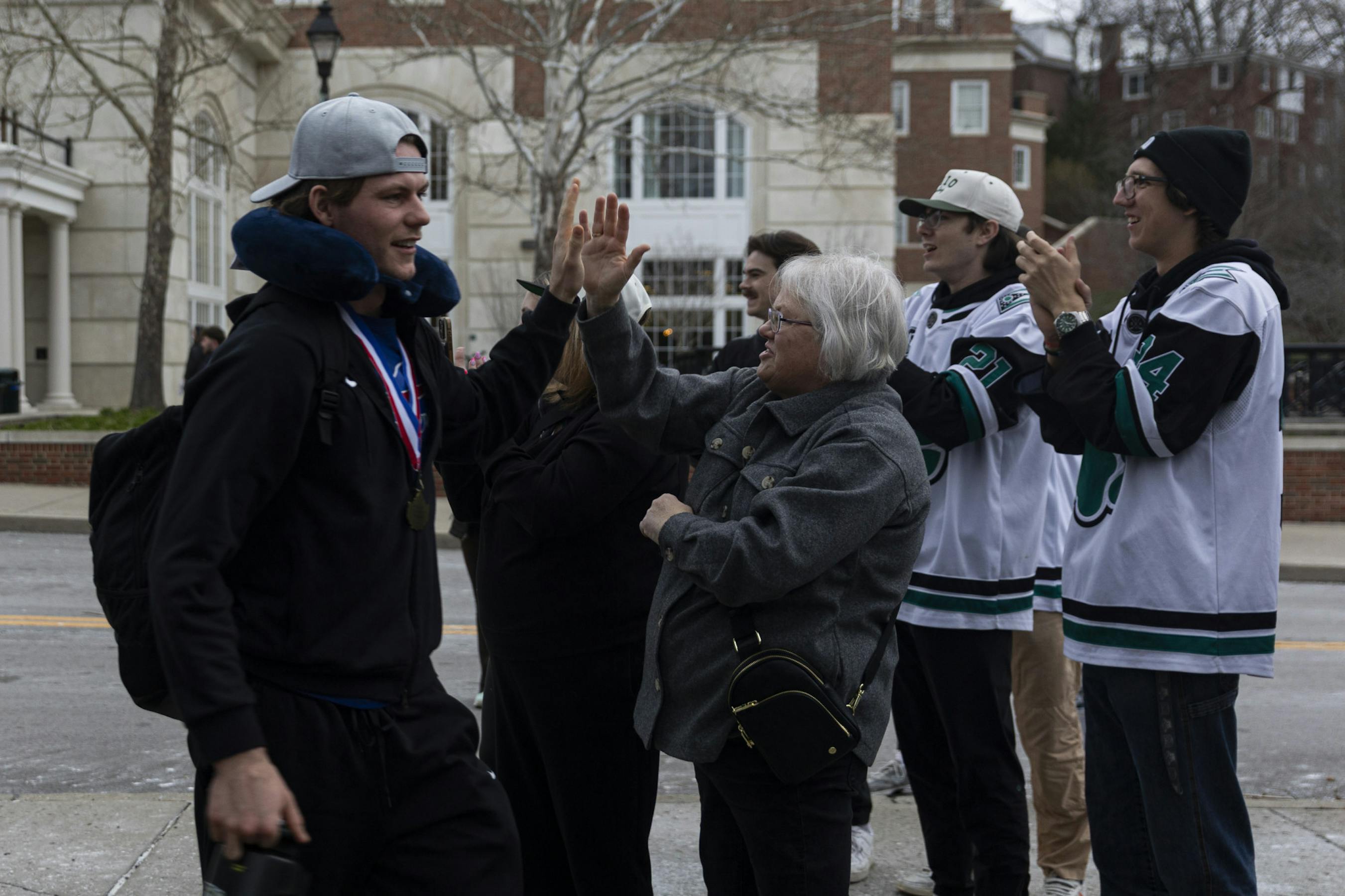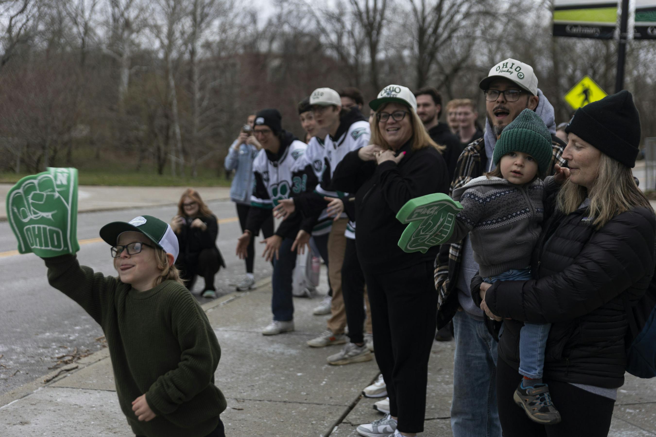 Fans welcome the hockey team back to campus, outside Bird Ice Arena, after their win at the ACHA National Championship game, March 18, 2026, in Athens.