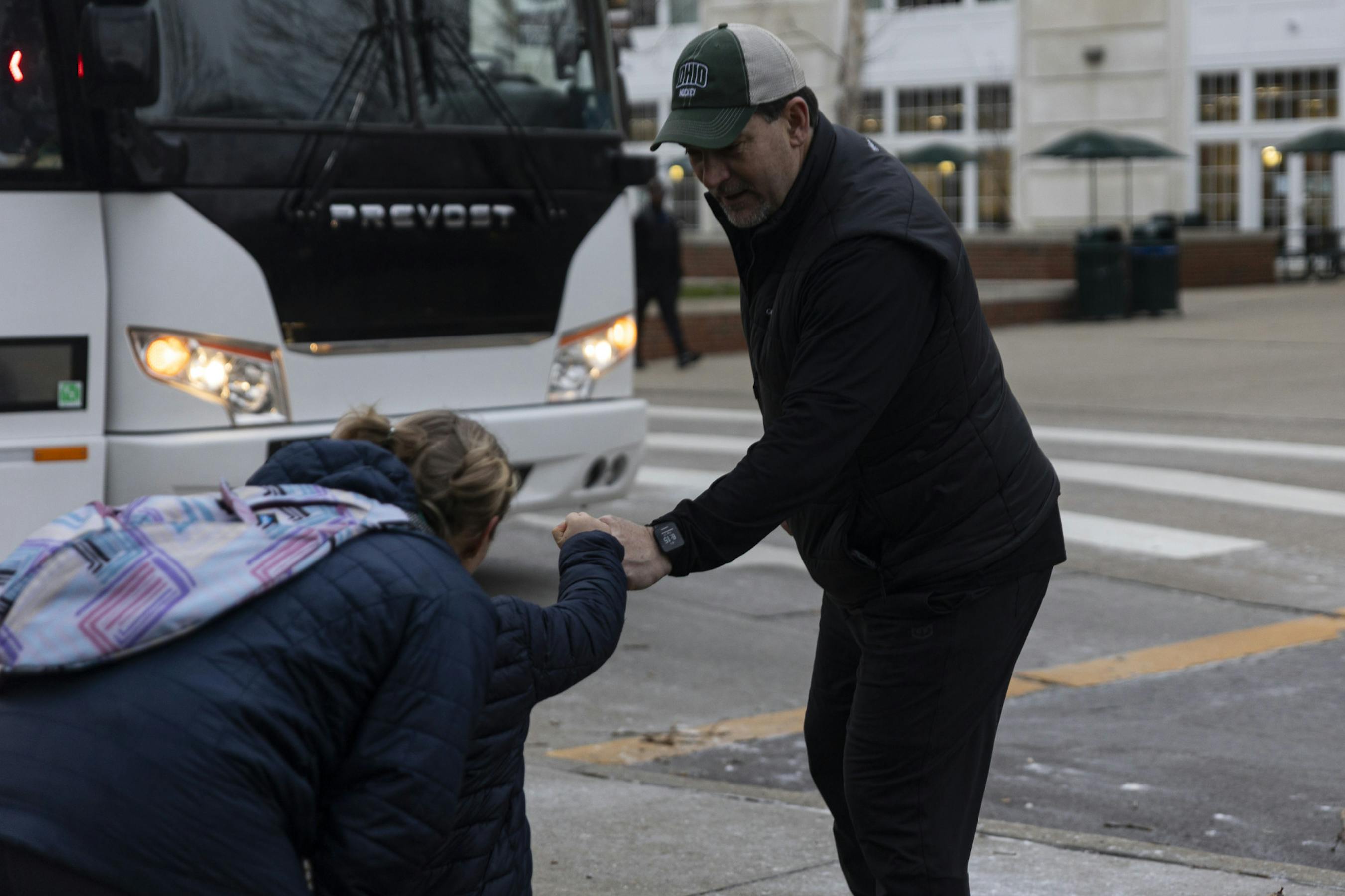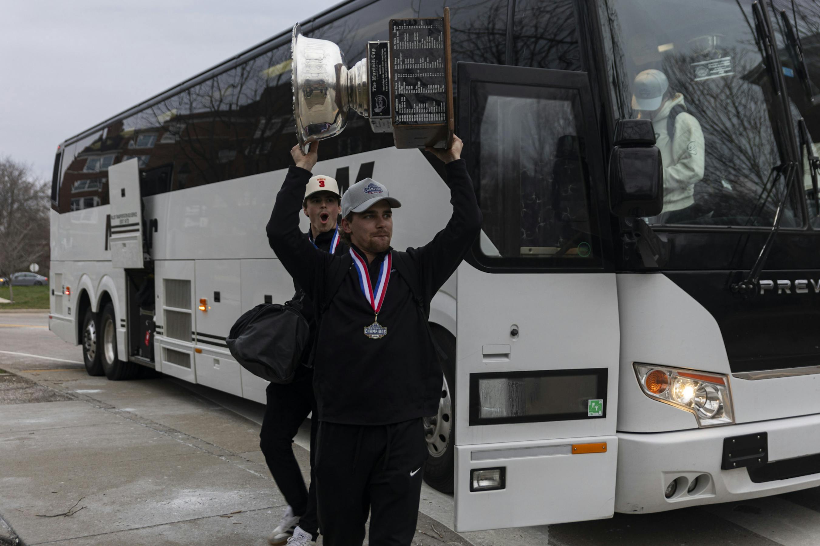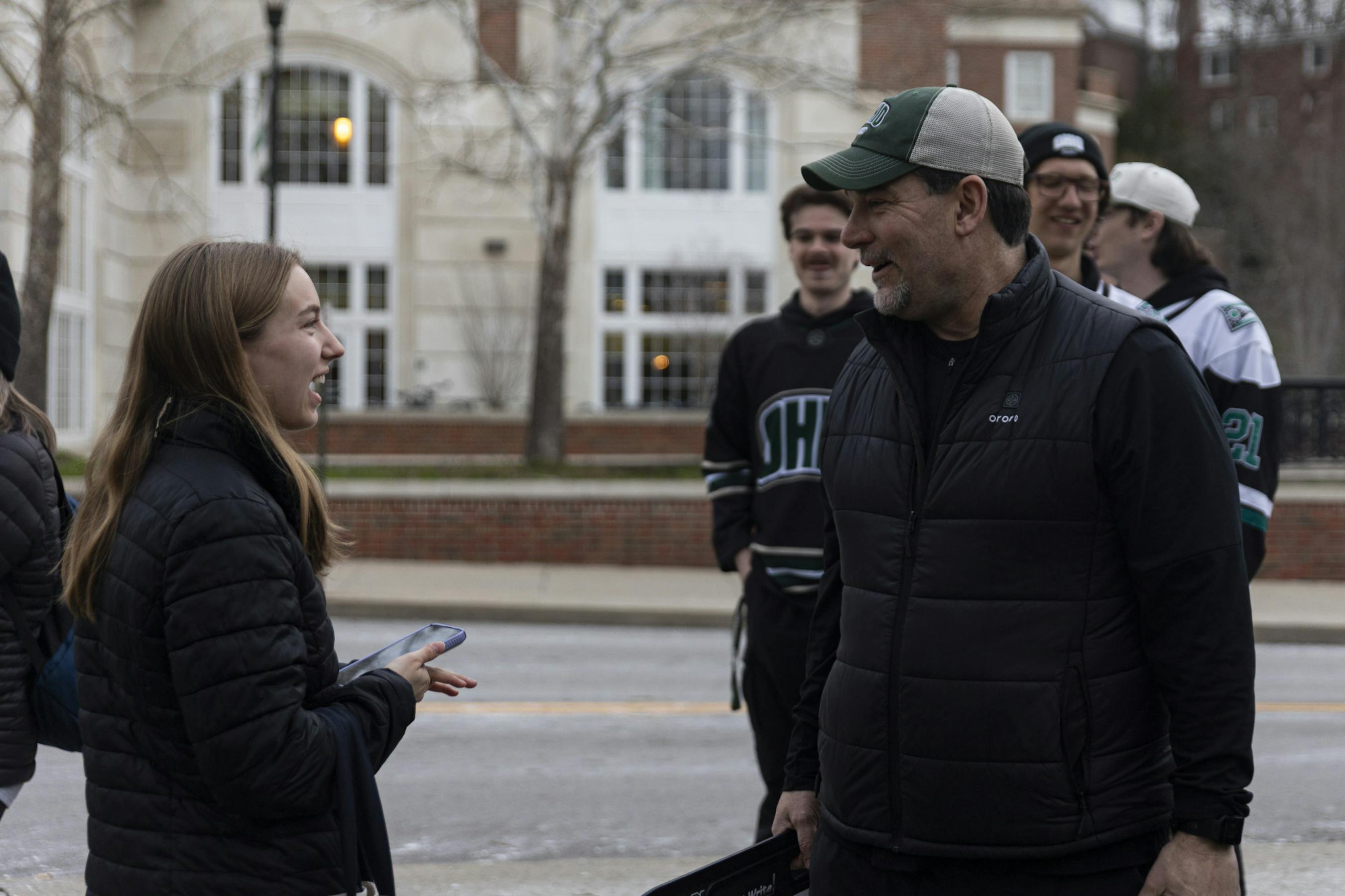 Fans welcome the hockey team back to campus, outside Bird Ice Arena, after their win at the ACHA National Championship game, March 18, 2026, in Athens.