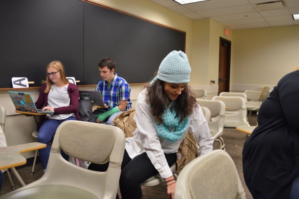 At the end of her break Brie Boothloy goes to her journalism discussion that is a part of J1010, or The Future of Media. The discussion class is much smaller, with about 30 students, than the lecture, which has about 200 journalism students.