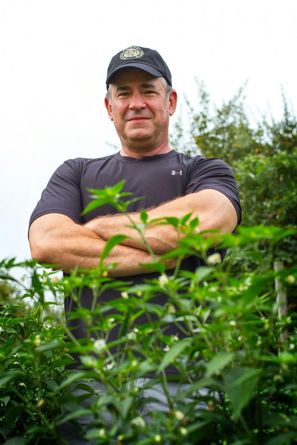 Steve Patterson stands in his field of peppers which he grows and sells to restaurants in town like Avalanche pizza and Kiser's BBQ. Patterson is an associate professor of psychology at Ohio University and a member of the Athens City Council.