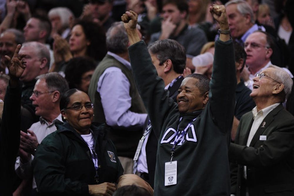 Ohio University President Roderick McDavis celebrates Ohio's 77-74 victory against Buffalo in Friday's Mid-American Conference Tournament semifinal game. Between football and men's basketball, the Bobcats have 36 wins, which is tied for the second-most in the country. (Brien Vincent | Staff Photographer)
