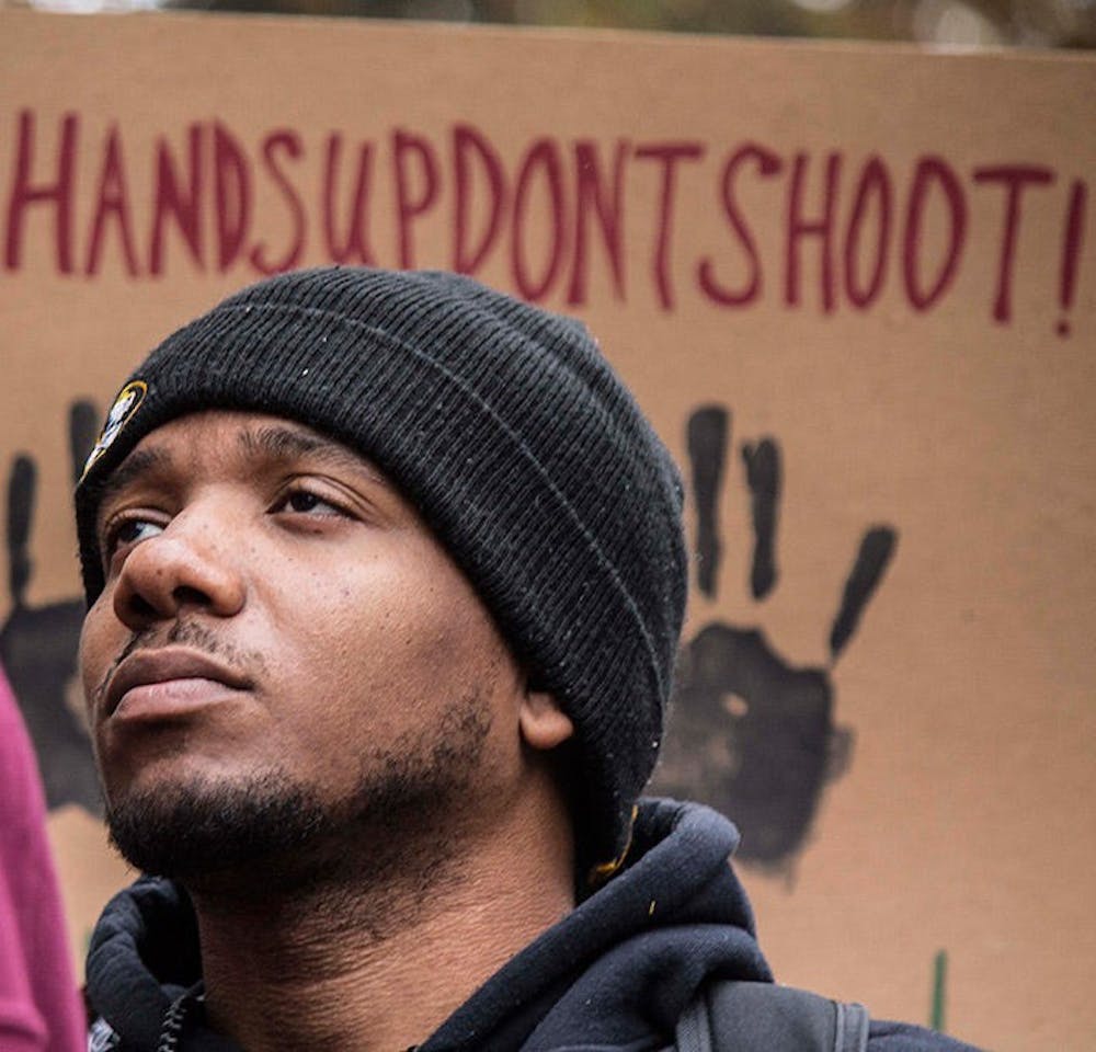 Paris Aaron, a senior studying communication, listens intently to the speakers at yesterday's Hands up Walk out protest on college green.
