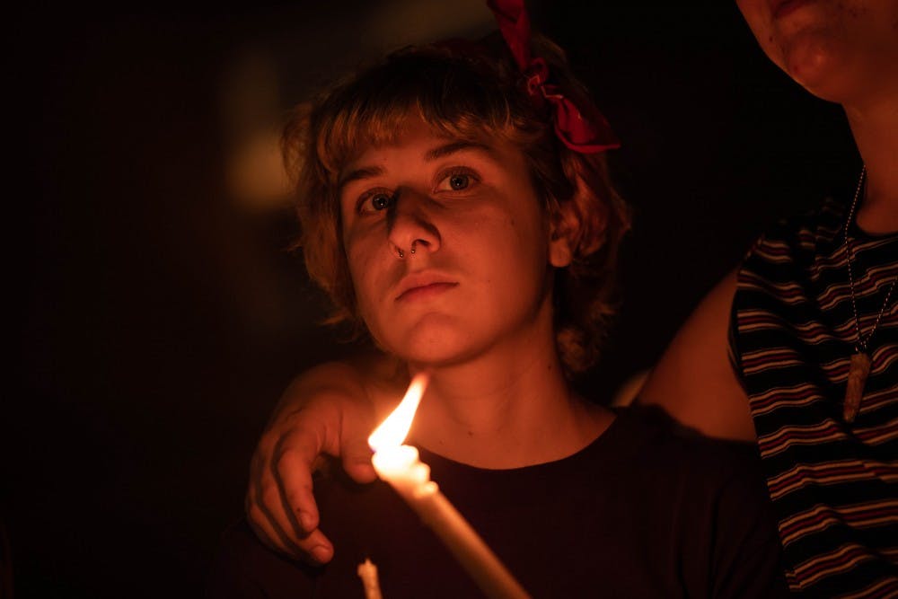 Bee Irwin listens to speakers at the Islamic Student Center at the Interfaith Peace Walk on Wednesday, Sept. 11, 2019.