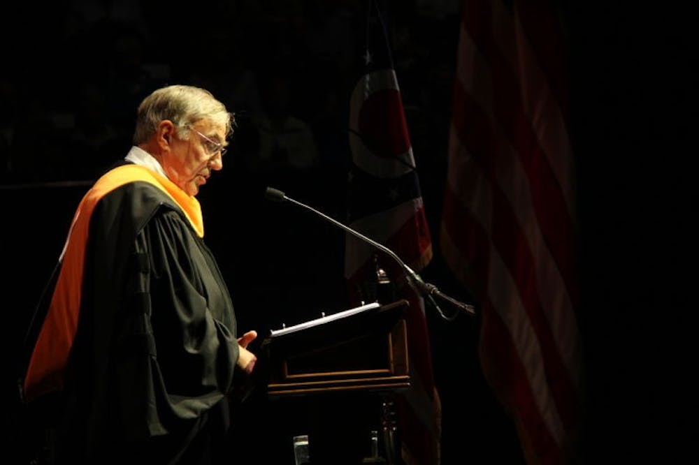 Charles R. Stuckey, Jr., who graduated from OU in 1966, was the keynote speaker at Saturday's two undergraduate commencement ceremonies. Stuckey told students to "get outside" their comfort zone. (Joshua Lim | For The Post)