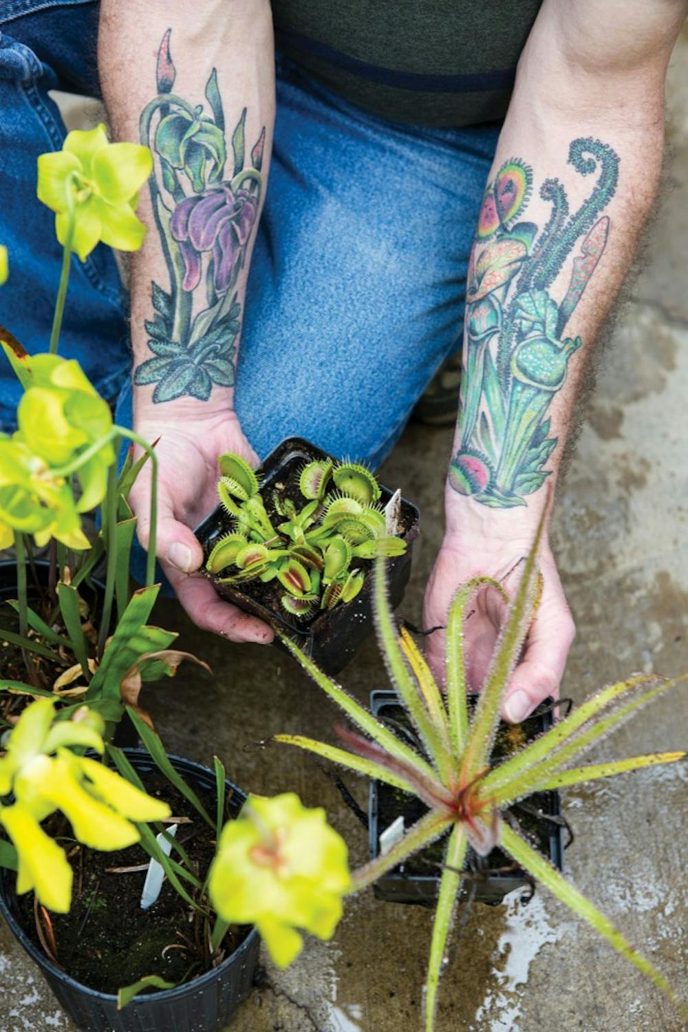 Harold Blazier, the greenhouse manager at OU, displays the plants his tattoos are modeled after, which include sarracenia, drosera and venus fly traps, in the Ohio University greenhouse on Feb. 24.