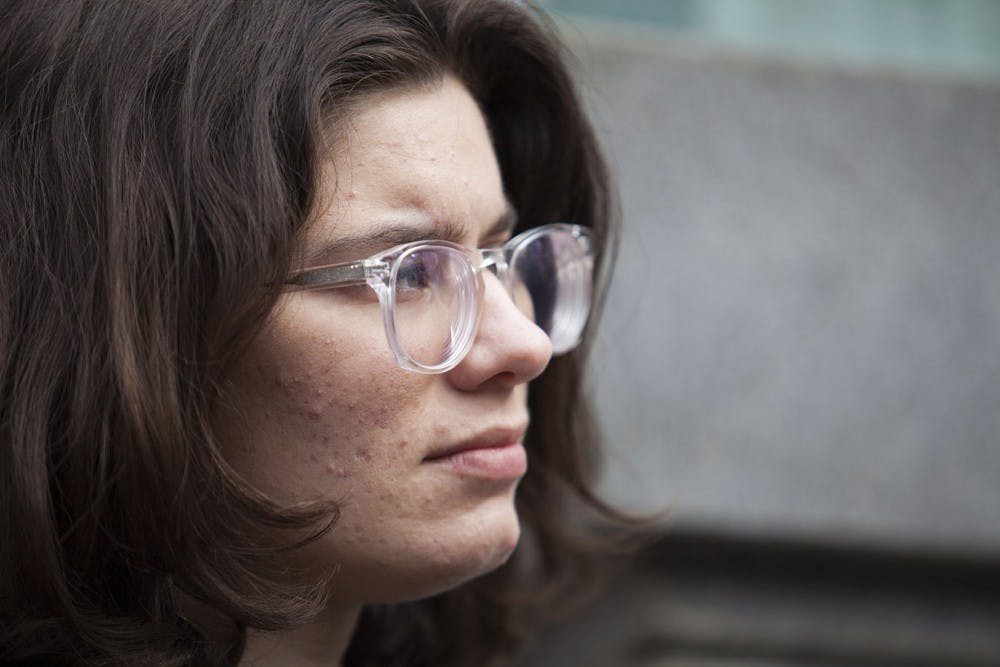 Megan Marzec, president of student senate, listens to speakers at a tuition hike protest on College Green, at Ohio University, in Athens, OH, on Friday, Jan. 23, 2015.