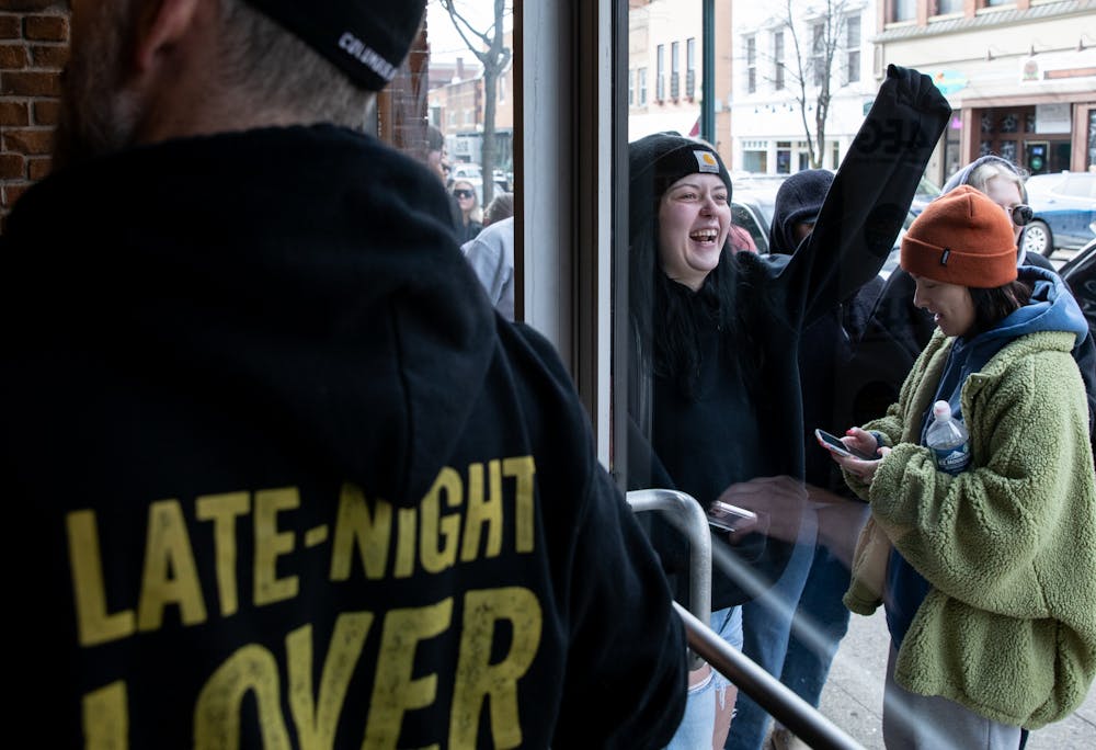 Reagan Mullikin waves at a friend passing by as she waits in line for the new Keystone Mac Shack to open on Court St. on Monday, Jan. 16, 2022.
