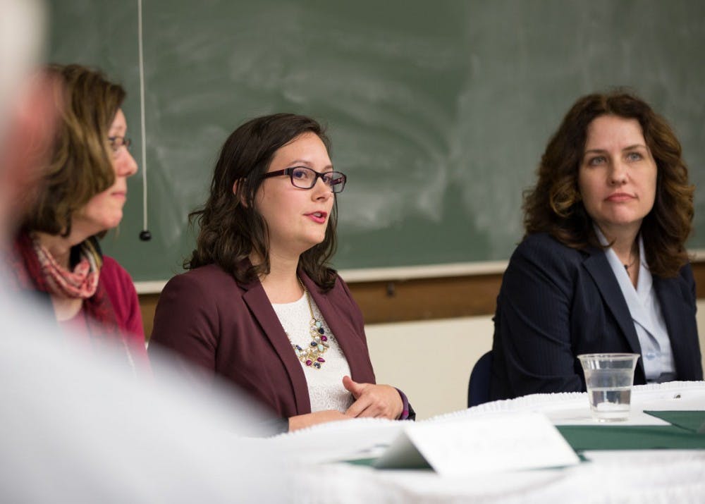 Dr. Kim Thompson (left), Christine Copa and Kristin Lowery (right) speak at a panel for professional strategies for women in STEM moderated by keynote speaker J.J. DiGeronimo in Porter Hall on April 6. The panel was put together by the Society for Women Engineers (SWE) at Ohio University.