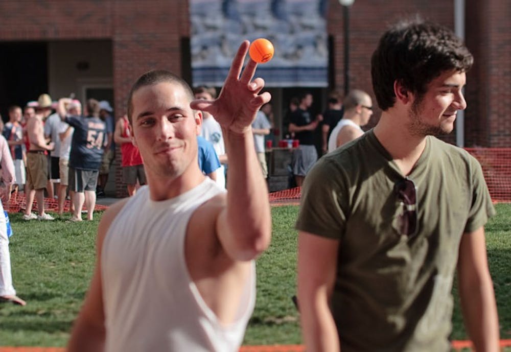 Drew Mullen, left, shoots a pong ball while his partner and roommate Max Baig talks with friends. The two students brought a table outside of their apartment to enjoy the weather and music while playing beer pong.