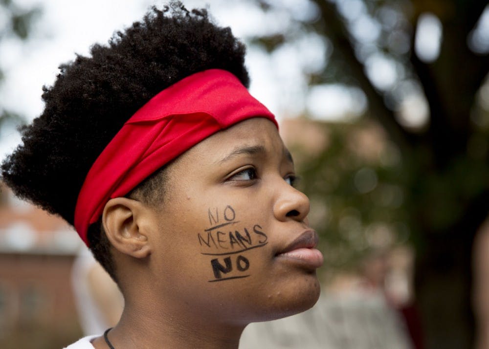 Anissa Matthews listens to speakers during a F--kRapeCulture rally Oct. 9, 2015.