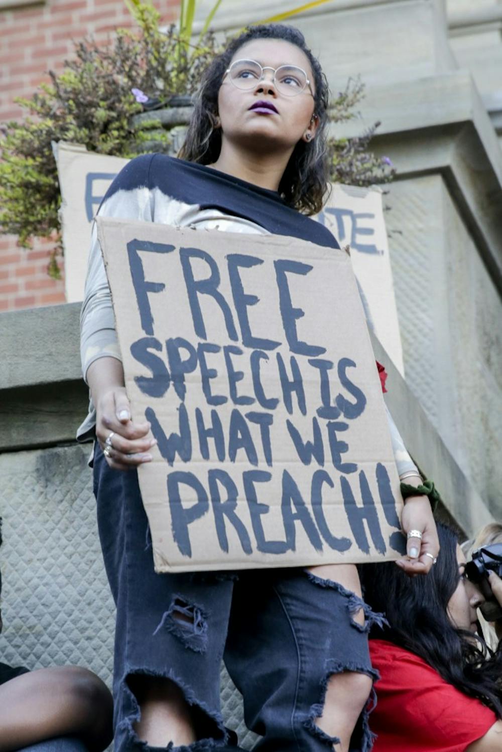 Gabriela Johnson, a senior studying English, stands and listens to speakers during Friday's protest against Ohio University's interim 'Freedom of Expression' policy.