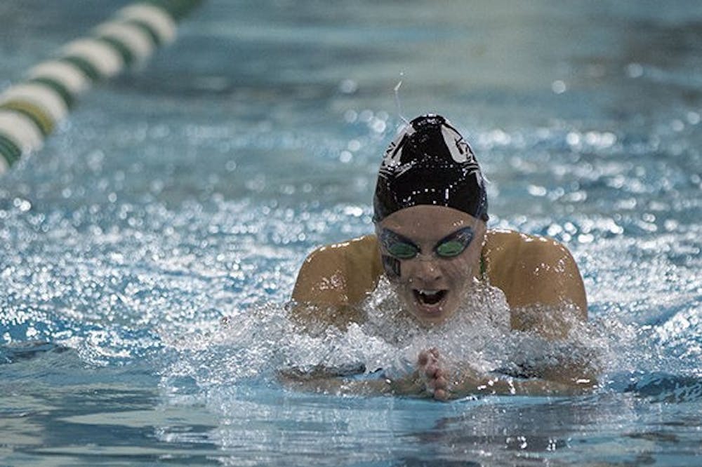 Ohio freshman Mackenzie Hornstra competes in the 200 yard breaststroke during a swim meet against Akron at the Aquatic Center on Oct. 30, 2016.