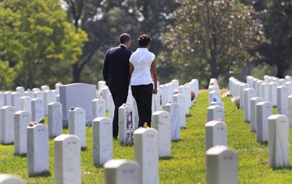President Barack Obama and first lady Michelle Obama visit Section 60 at Arlington National Cemetery, Saturday, Sept. 10, 2011, in Arlington, Va., to pay their respects to those who have made the ultimate sacrifice in the past decade. Section 60, in the southeast part of the cemetery, is the burial ground for military personnel killed in the Iraq and Afghanistan wars.(AP Photo/Carolyn Kaster)