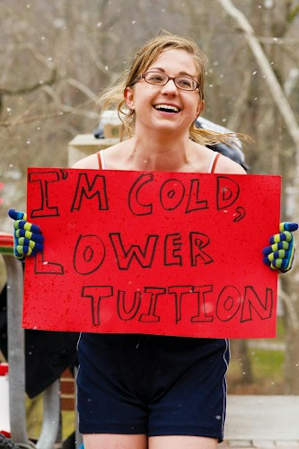 the member of OU Student Union, Ellie Hamrick, jumping and singing to make herself feel warm. Junior OU Student Union member Ellie Hamrick holds a sign with other members to protest for a tuition freeze on Thursday.