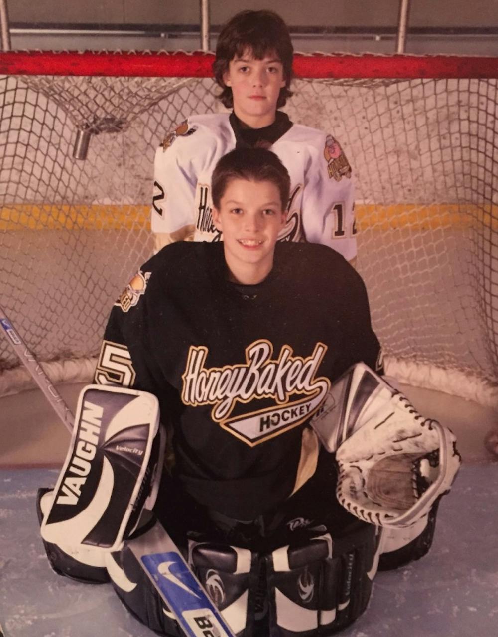 Garrett Jenkins, back, and his brother Ian Jenkins pose for a portrait in their hockey uniforms.