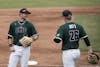 Ruby Rott and Tony Giannini joke during Ohio's first game in a double header against Siena University on Saturday (BLAKE NISSEN | FOR THE POST)