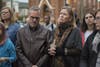 Sally Sugar, an Ohio University alumna, reacts to a speaker during a demonstration outside of Cutler Hall. The demonstration was held after the unexpected dismissal of delfin bautista, the LGBTQ Center Director.
